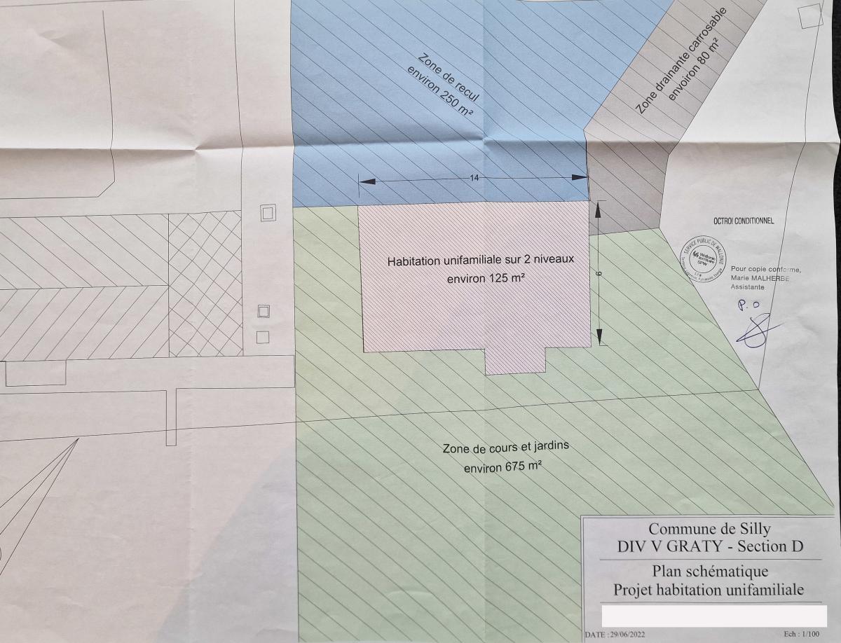 Situé à Graty, un charmant village de la superbe commune de Silly, ce terrain de 12a43ca en fera rêver plus d’un. Surplombant une petite vallée, vous serez séduits par la vue arrière qu’offre cette jolie parcelle, orientée sud-est, et beignée dans un environnement rimant avec campagne, verdure, et zénitude. Localisé en zone agricole, dans un périmètre d’intérêt paysager, le terrain a fait l’objet d’un CU2, octroyé pour la construction d’une habitation unifamiliale en 4 façades (+/-14m de large sur +/-6m de profondeur), sur 2 niveaux, avec toiture à 2 versants (hauteur sous corniche de +/-3m50), et une implantation sur le niveau naturel du terrain, avec un front bâti dans le même plan que la maison voisine, en recul de 12m50. Prescriptions urbanistiques disponibles sur simple demande à l’agence. Gare d’Enghien à +/-7.7km (train direct vers Bruxelles en +/-20min), E429 à +/-5.1km (Bruxelles, Tournai, Lille), centre d’Enghien à +/-6km (commerces, restaurants, marché hebdomadaire, écoles, grandes surfaces). Prix : faire offre à partir de 139 000 euros sous réserve d’acceptation des vendeurs. L’entité de Silly étant réputée pour sa campagne vallonnée, ses bois parmi les plus beaux de la région, sa magnifique forêt domaniale, ses producteurs locaux, son dynamisme culturel, … vous pouvez nous croire…vous vous y sentirez bien ! Silly est une commune qui met un point d’orgue à la qualité de vie !