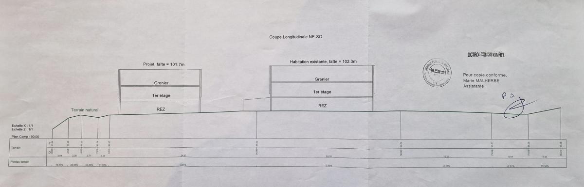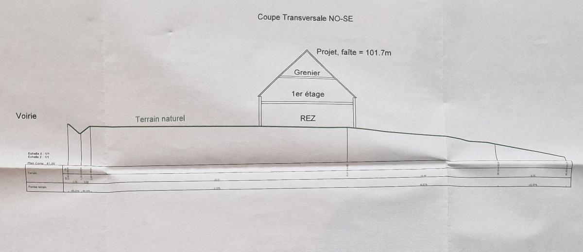 CU2 octroyé pour la construction d’une habitation unifamiliale : -4 façades -sur 2 niveaux -toiture à 2 versants -implantation sur le niveau du terrain naturel -front bâti dans le même plan que celui de la maison voisine de droite (numéro 104), soit en recul de +/-12m50 -construction de +/-14m de large sur +/-6m de profondeur
