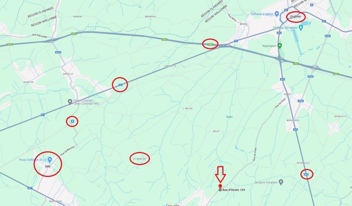 Gare de Silly à +/-9.9km (train direct vers Bruxelles en +/-30min) Gare d’Enghien à +/-7.7km (train direct vers Bruxelles en +/-20min) Autoroute A8/E429 à +/-5.1km (Bruxelles, Tournai, Lille)