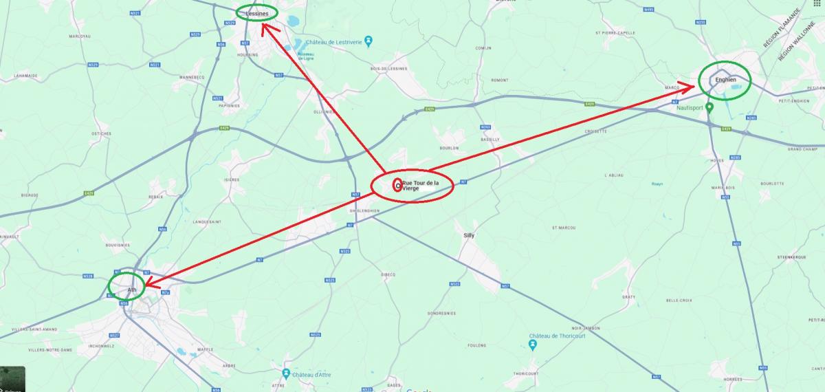 Biévène à +/-8.4km Lessines à +/-9.5km Ath à +/-11.3km Enghien à +/-11.8km Soignies à +/-17.5km Grammont à +/-17.9km Halle à +/-28.3km Tournai à +/-40.7km Bruxelles à +/-47.9km