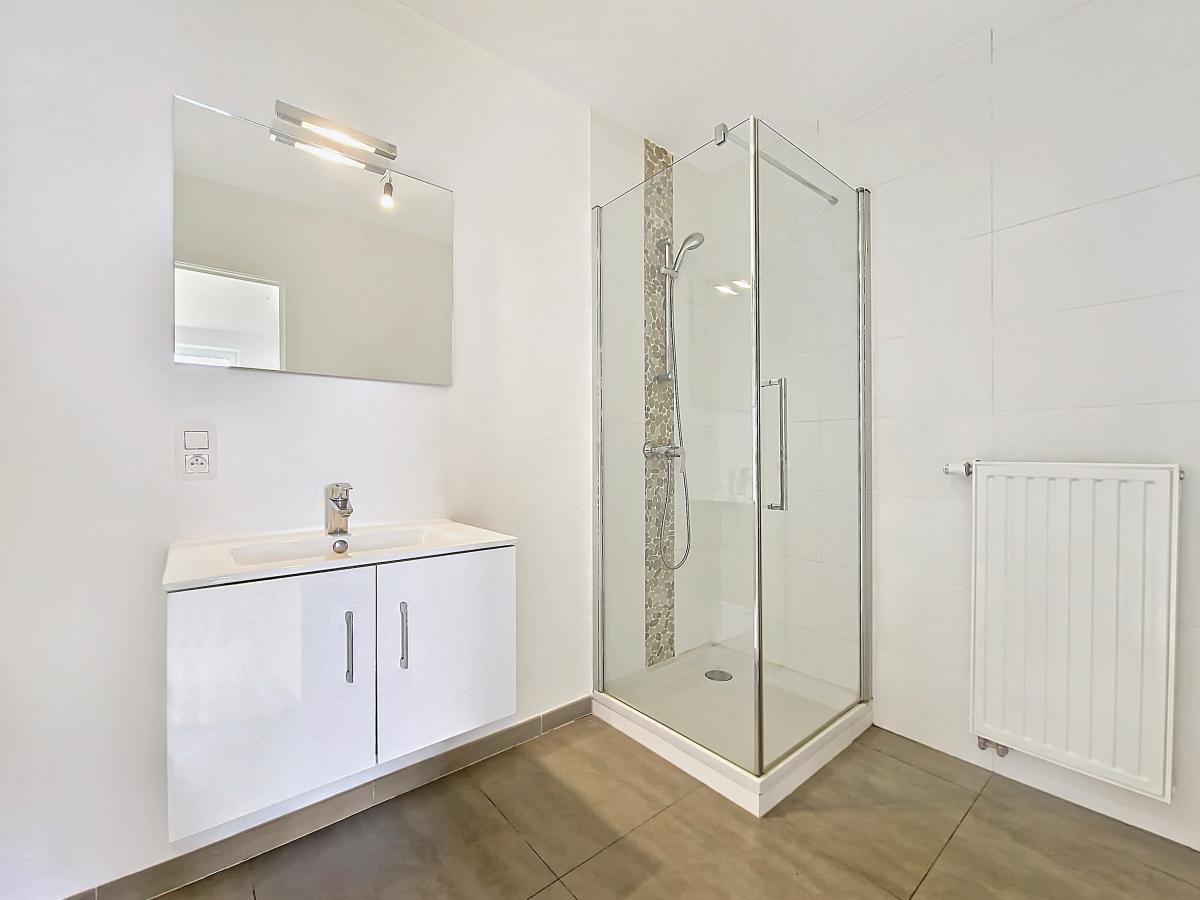 Équipements cuisine : frigo Junker, petit congélateur, four Bosch, taque vitrocéramique Bosch, hotte Whirlpool, évier, égouttoir, lave-vaisselle Bosch Équipements pièce d’eau : douche, meuble-évier avec miroir et luminaire intégré