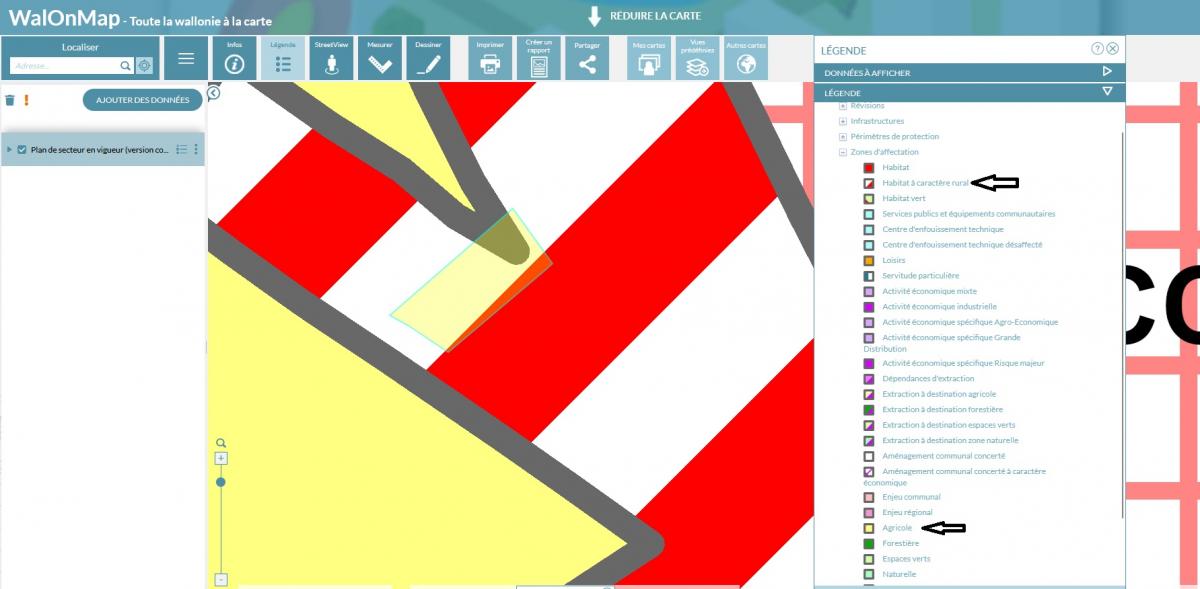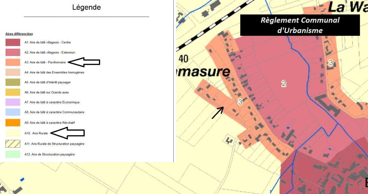 Prescriptions urbanistiques disponibles sur simple demande à l’agence Plan de secteur : zone d’habitat à caractère rural majoritairement, et agricole sur une superficie de +/-40m² Au Guide Communal d’Urbanisme : aire de bâti pavillonnaire et aire rurale