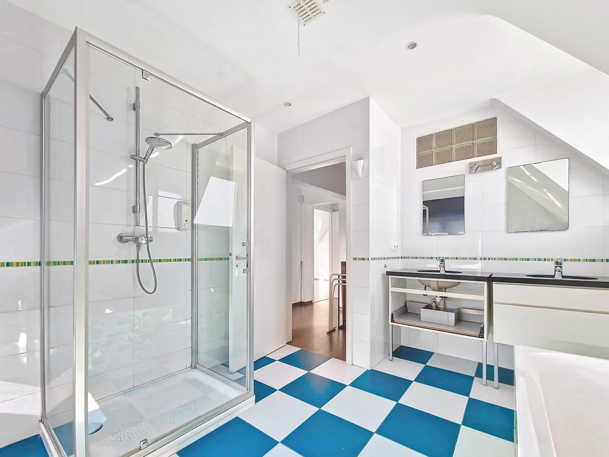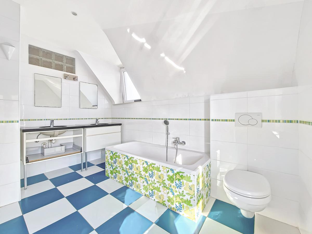Équipements salle de bains : douche, 2 éviers, baignoire, WC suspendu