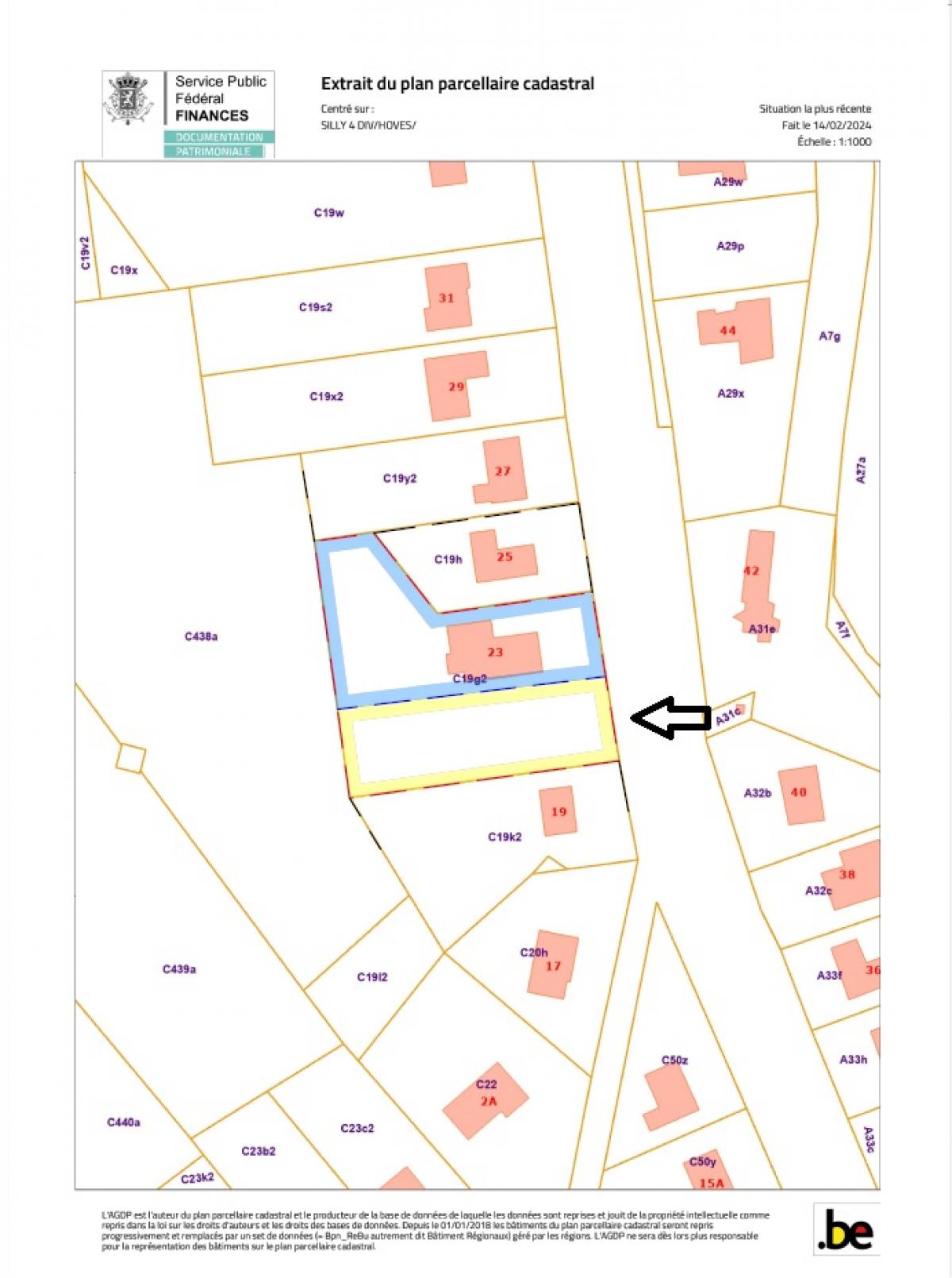 Le terrain représente une partie de la parcelle C19g2. La parcelle C19g2 se situe : -au plan de secteur de ATH-LESSINES-ENGHIEN : en zone d'habitat à caractère rural sur une profondeur de+/- 50m à partir du bord de la voirie ; le reste étant en zone agricole -au schéma de développement communal : en zone d'habitat située le long des grands axes & zone agricole destinée à l'agriculture -au guide communal d'urbanisme : aire de bâti sur grands axes & aire rurale agricole