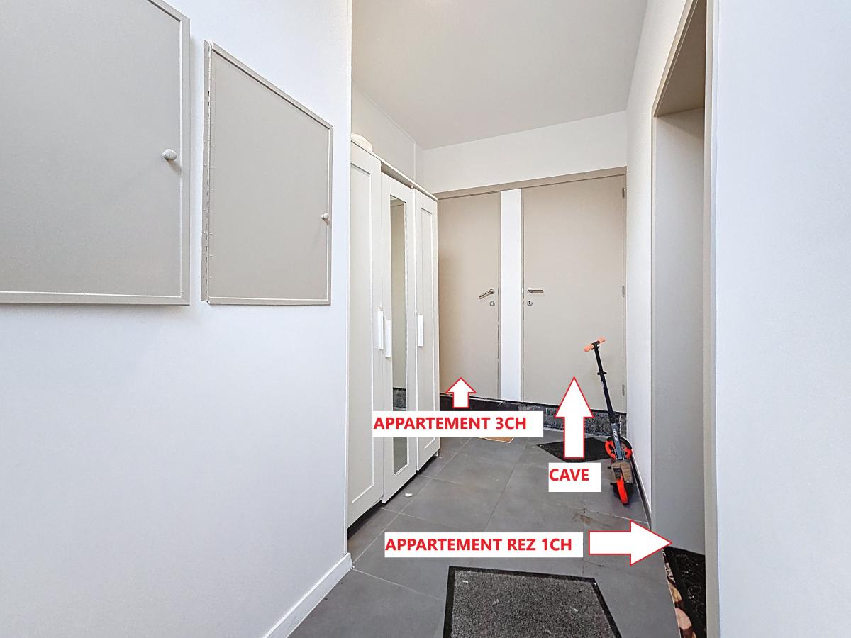 Hall commun (de +/-7.8m²) desservant : -la cave (de +/-32.8m²) située au sous-sol de l’immeuble -l’appartement 3 chambres -l’appartement rez-de-chaussée 1 chambre