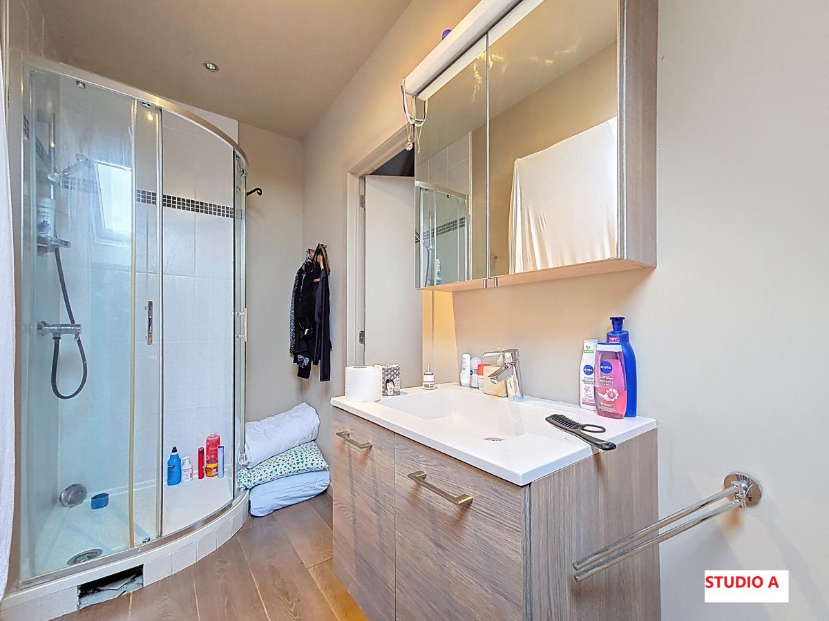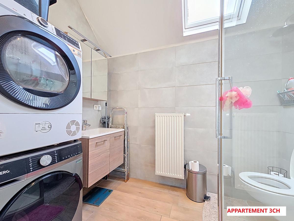 Location en cours : loyer actuel de 845 euros (compris : eau, électricité, chauffage) Châssis double vitrage haut rendement PVC Installation de chauffage central collectif, chaudière mazout non à condensation Pas de thermostat d’ambiance Installation d’eau chaude sanitaire : production avec stockage par chaudière Cuisine : taque Zanussi, hotte Bosh, évier, égouttoir, lave-vaisselle Zanussi, frigo, four Zanussi Salle de douche : WC, douche, meuble évier, meuble suspendu avec miroir, raccordement pour machine à laver Revêtements des sols : carrelage