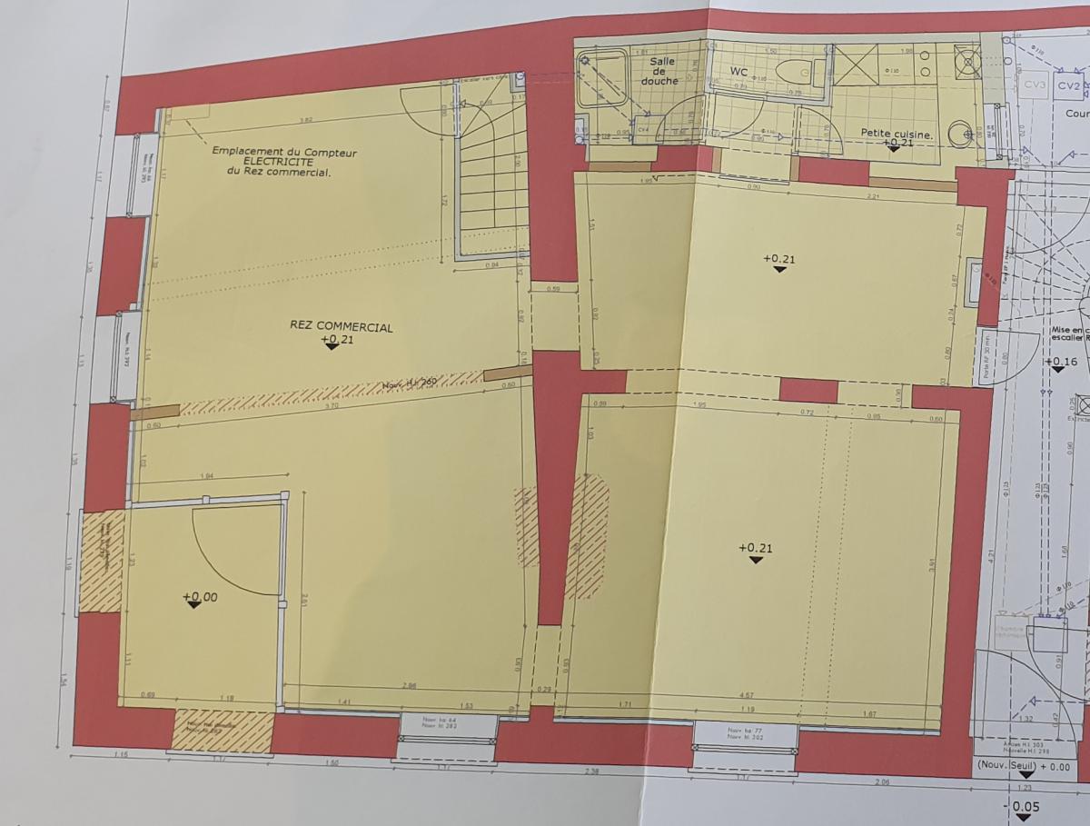 Commerce (pièce principale) de +/-30m² Commerce (pièce secondaire) de +/-17.5m² Pièce arrière/réserve de +/-7.2m² Pièce de stockage de +/-6m² Hall d’accès au WC et à la cuisine de +/-1.7m² WC/salle de douche de +/-3m² Cuisine de +/-4.5m²