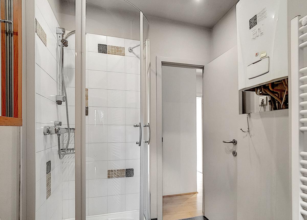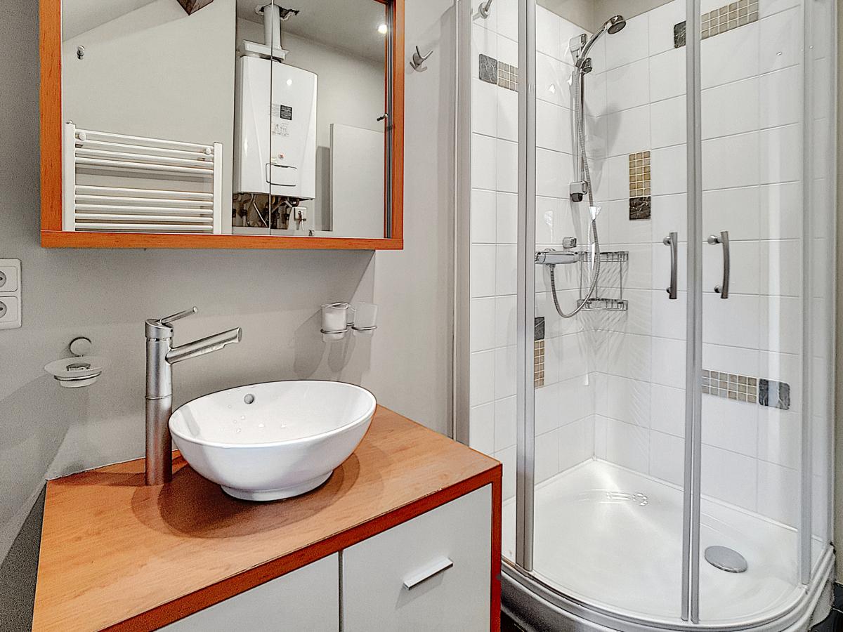 Équipements cuisine : plan de travail, évier, égouttoir, lave-vaisselle (Candy), four (Candy), taque vitrocéramique (Candy), hotte (Candy), frigo (Candy), Équipements salle d’eau : douche, meuble-vasque, meuble-miroir avec luminaire intégré, radiateur porte-serviettes WC séparé : toilette suspendue