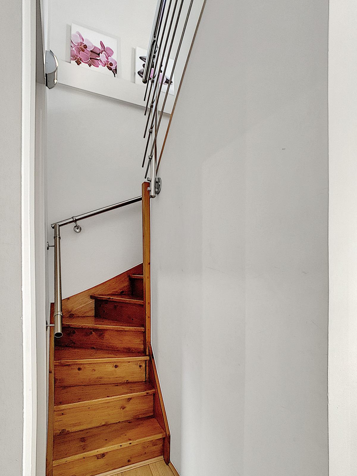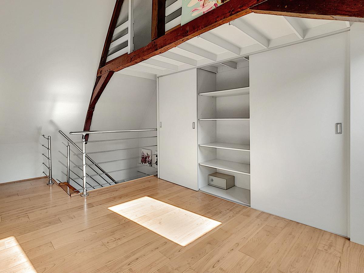 Chambre du 2ème étage avec placard encastré sur mesure + mezzanine Au rez-de-chaussée : compteur gaz, compteur électrique, tableau des fusibles, parlophone
