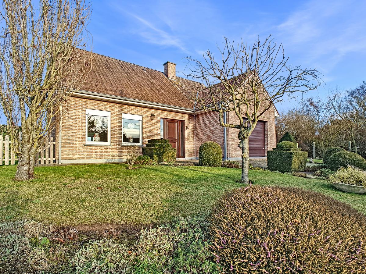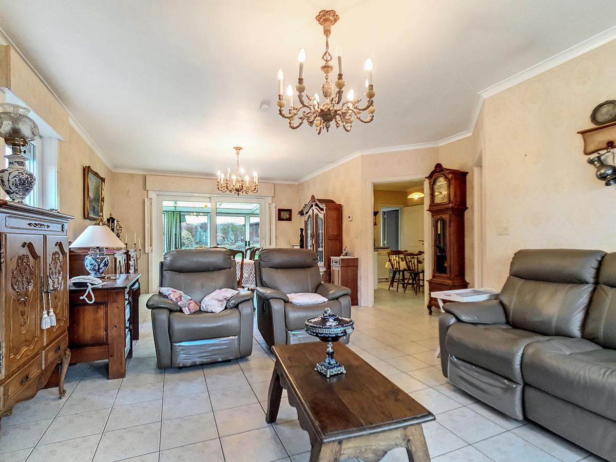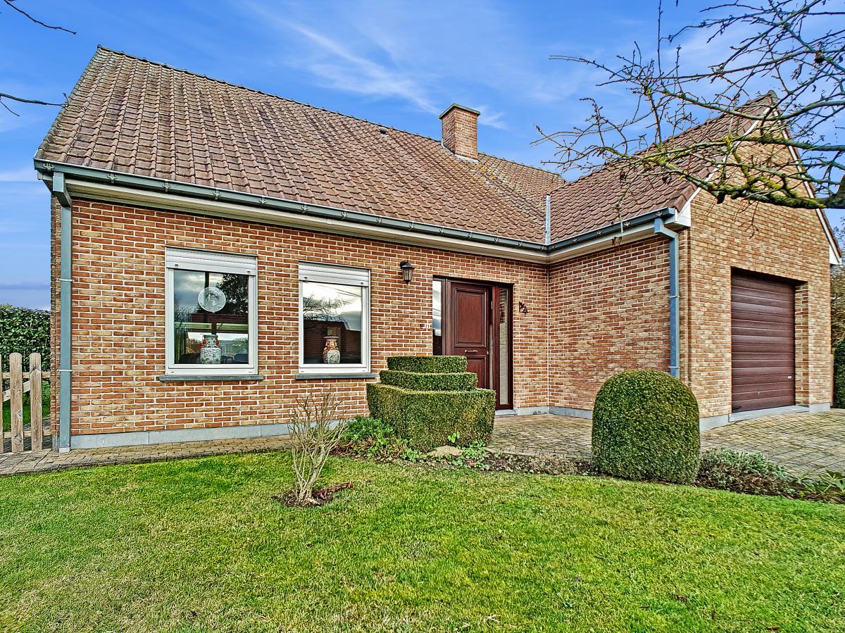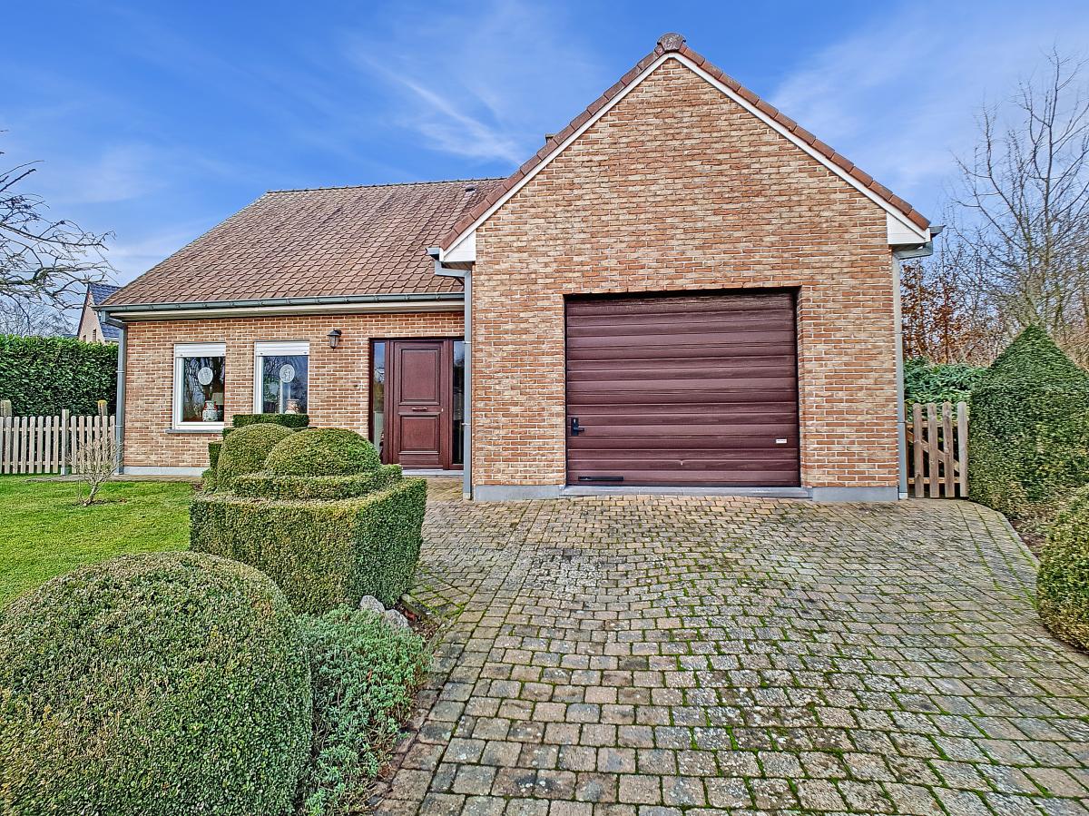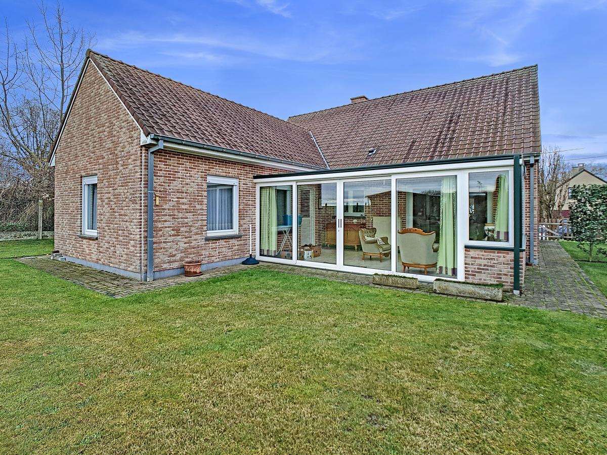 Située à Chapelle-à-Oie, sur une parcelle de 15a85, cette maison plain pied vous séduira par sa luminosité et ses surfaces. D’une superficie de +/-147m², cette construction vous offre un hall d’entrée avec WC séparé, un spacieux séjour, une cuisine équipée de +/-14.5m², un hall de nuit, 2 chambres à coucher (de +/-14.4 et 12.6m²), une salle de bains (avec WC, baignoire, meuble-évier), un grand garage carrelé et chauffé de +/-33.5m² avec porte électrique, et une véranda de +/-20m² donnant sur un agréable jardin avec chalet. D’un point de vue technique : maison préfabriquée Danilith, système de chauffage central au mazout (chaudière Viessmann), châssis PVC double vitrage, installation électrique conforme, citerne d’eau de pluie avec groupe hydrophore, volets. Commodités : E429 à +/-10km (Bruxelles-Tournai-Lille), N7 à +/-1.5km, gare d’Ath à +/-10.8km (train direct vers Bruxelles en +/-40min), gare de Leuze à +/-5.2km, arrêt de bus à +/-220m. Prix : faire offre à partir de 220 000 EUROS sous réserve d’acceptation des vendeurs. Visite virtuelle sur demande.