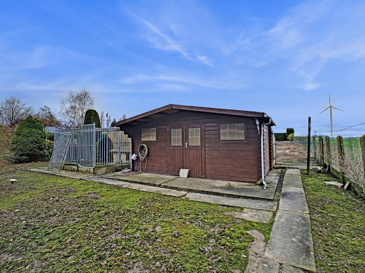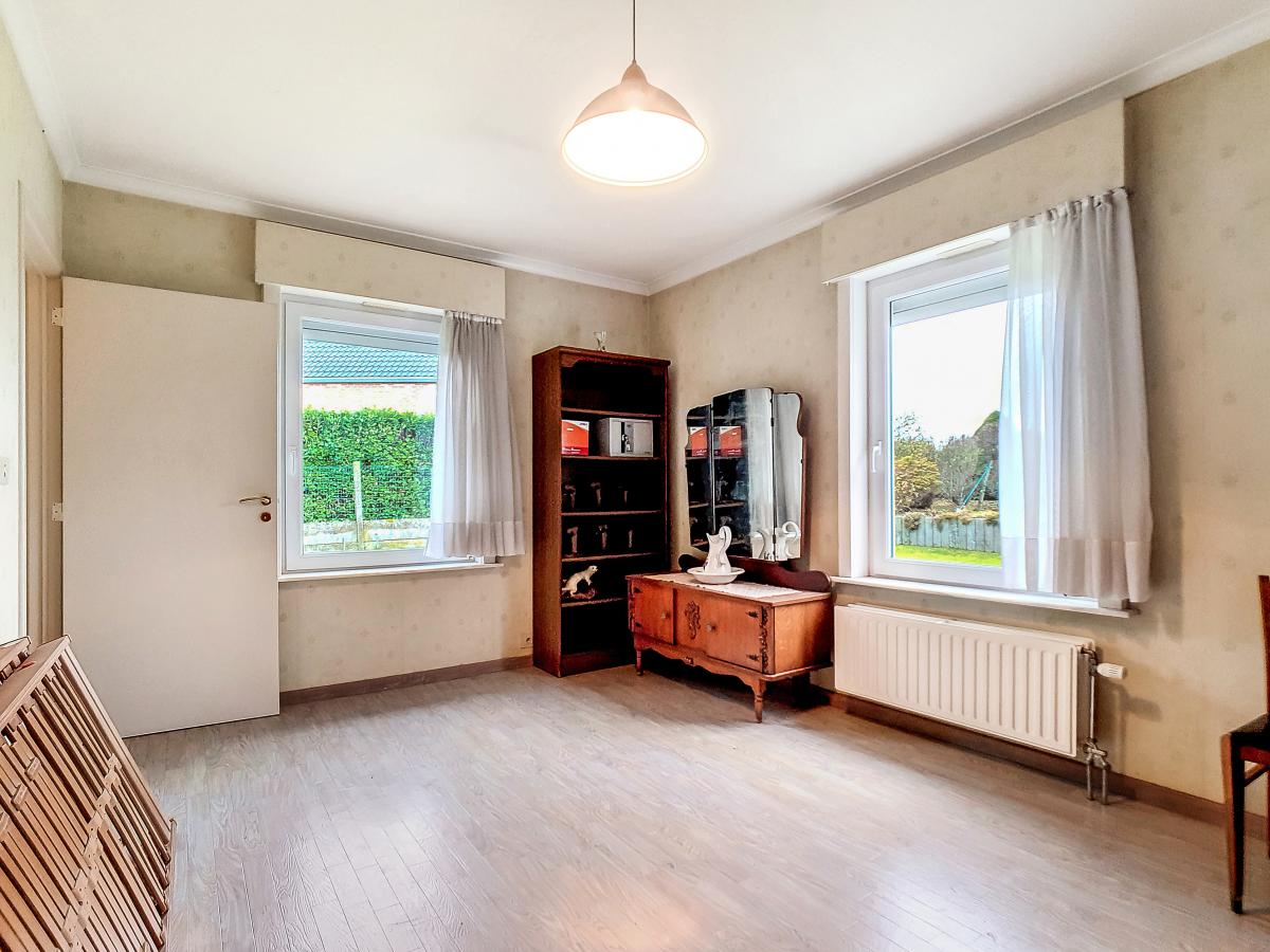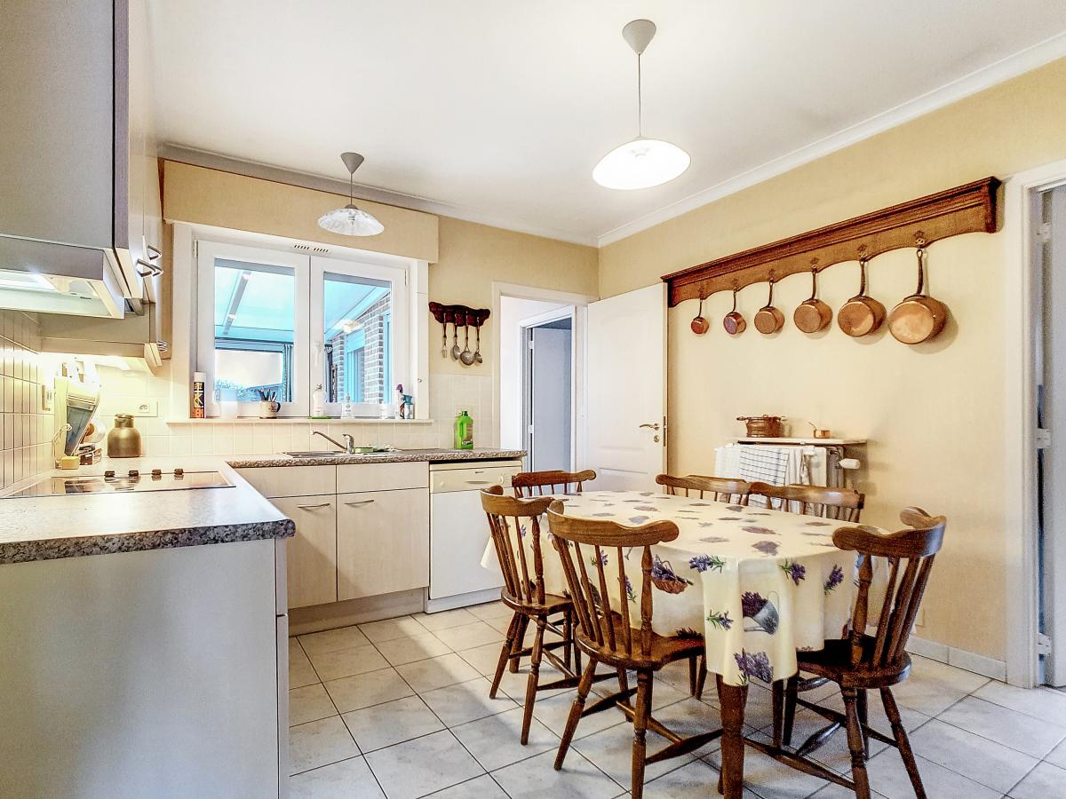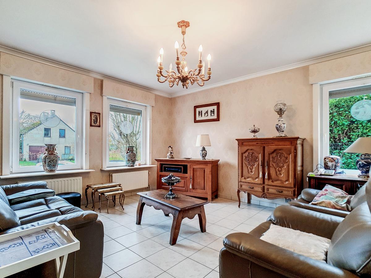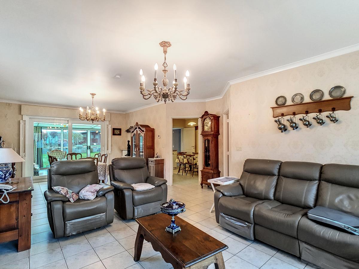 Située à Chapelle-à-Oie, sur une parcelle de 15a85, cette maison plain pied vous séduira par sa luminosité et ses surfaces. D’une superficie de +/-147m², cette construction vous offre un hall d’entrée avec WC séparé, un spacieux séjour, une cuisine équipée de +/-14.5m², un hall de nuit, 2 chambres à coucher (de +/-14.4 et 12.6m²), une salle de bains (avec WC, baignoire, meuble-évier), un grand garage carrelé et chauffé de +/-33.5m² avec porte électrique, et une véranda de +/-20m² donnant sur un agréable jardin avec chalet. D’un point de vue technique : maison préfabriquée Danilith, système de chauffage central au mazout (chaudière Viessmann), châssis PVC double vitrage, installation électrique conforme, citerne d’eau de pluie avec groupe hydrophore, volets. Commodités : E429 à +/-10km (Bruxelles-Tournai-Lille), N7 à +/-1.5km, gare d’Ath à +/-10.8km (train direct vers Bruxelles en +/-40min), gare de Leuze à +/-5.2km, arrêt de bus à +/-220m. Prix : faire offre à partir de 220 000 EUROS sous réserve d’acceptation des vendeurs. Visite virtuelle sur demande.