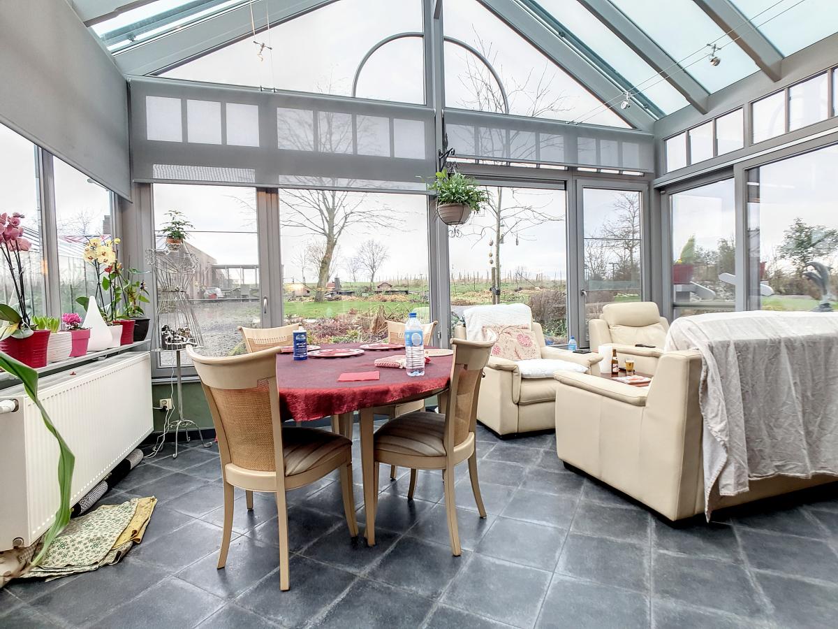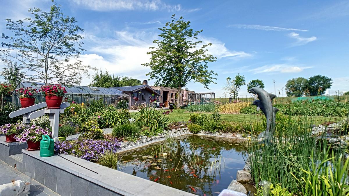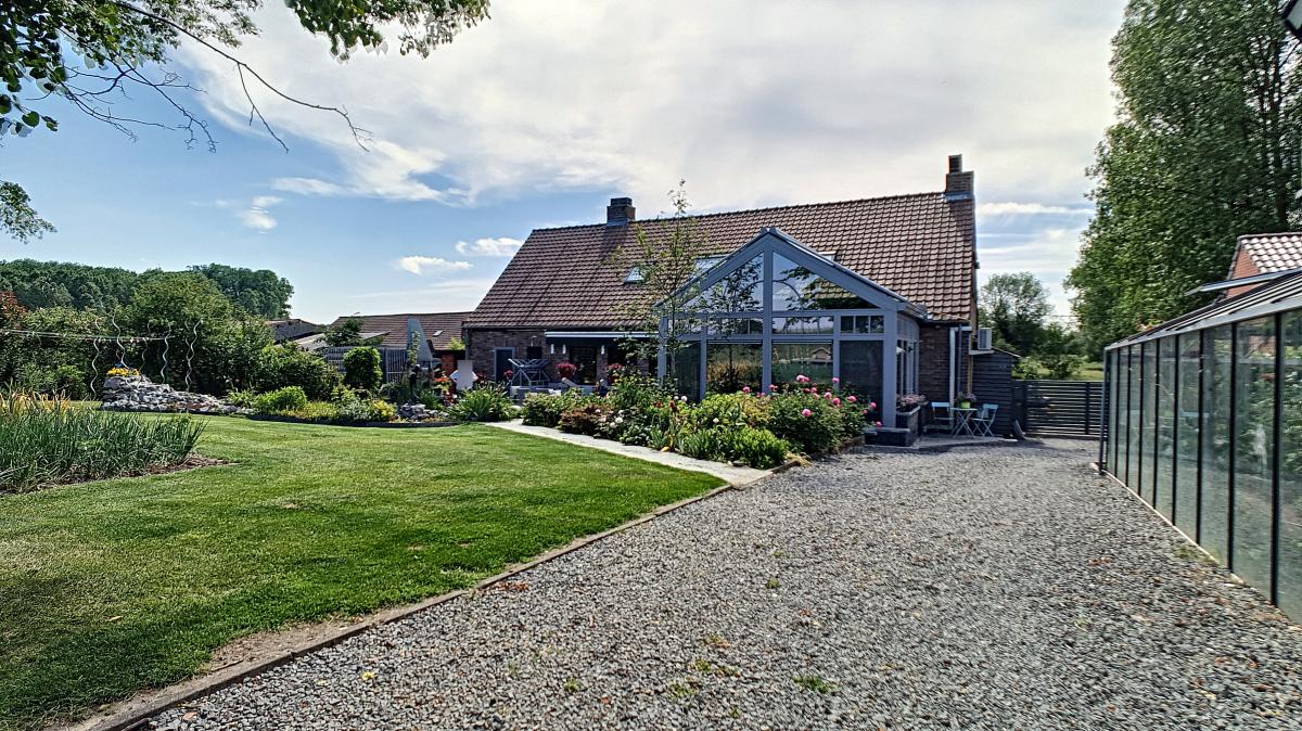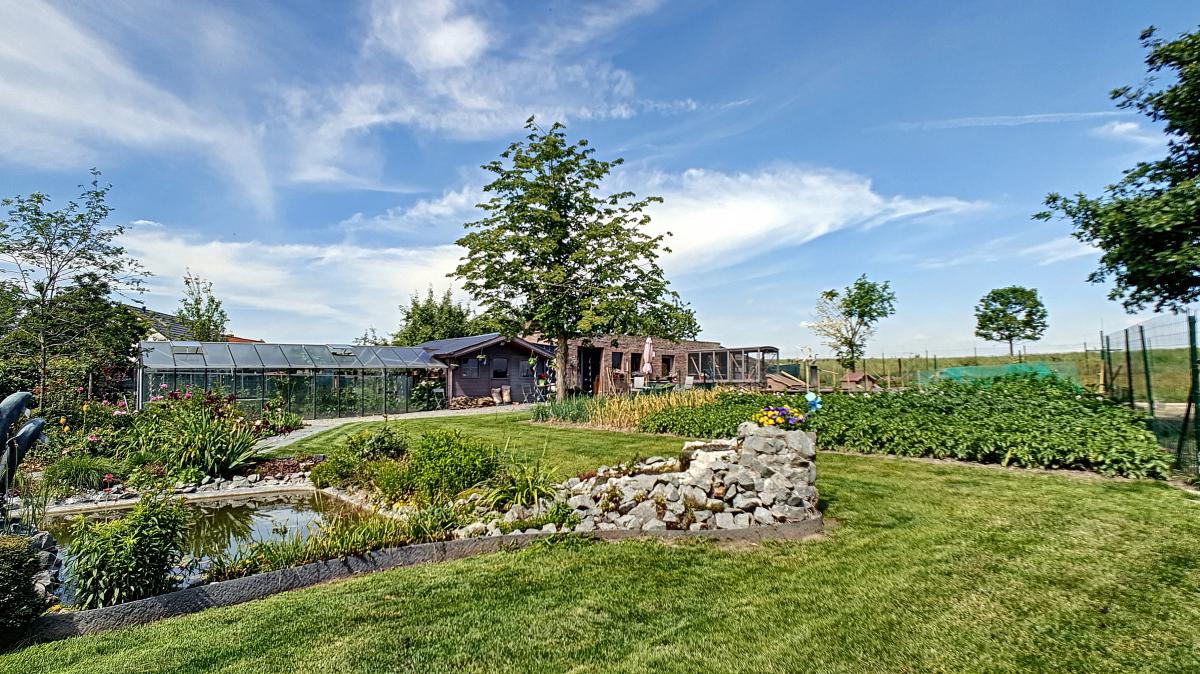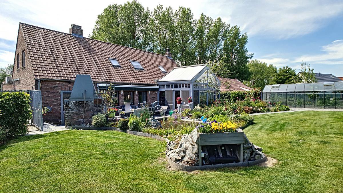 Allée face au double garage + allée latérale (le tout est pavé) Terrasse avec tente solaire Plan d’eau Barbecue Serre Bergerie de +/-142m²
