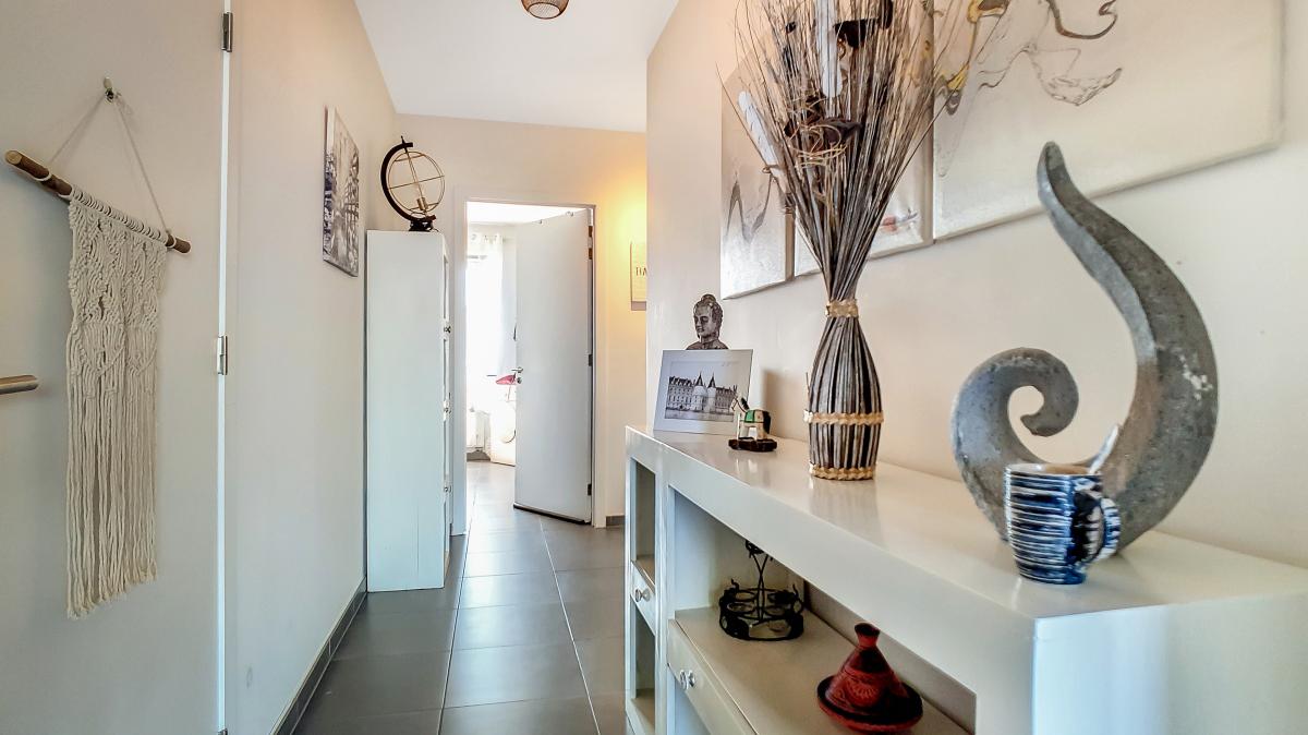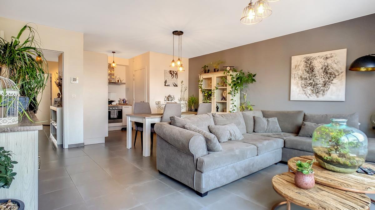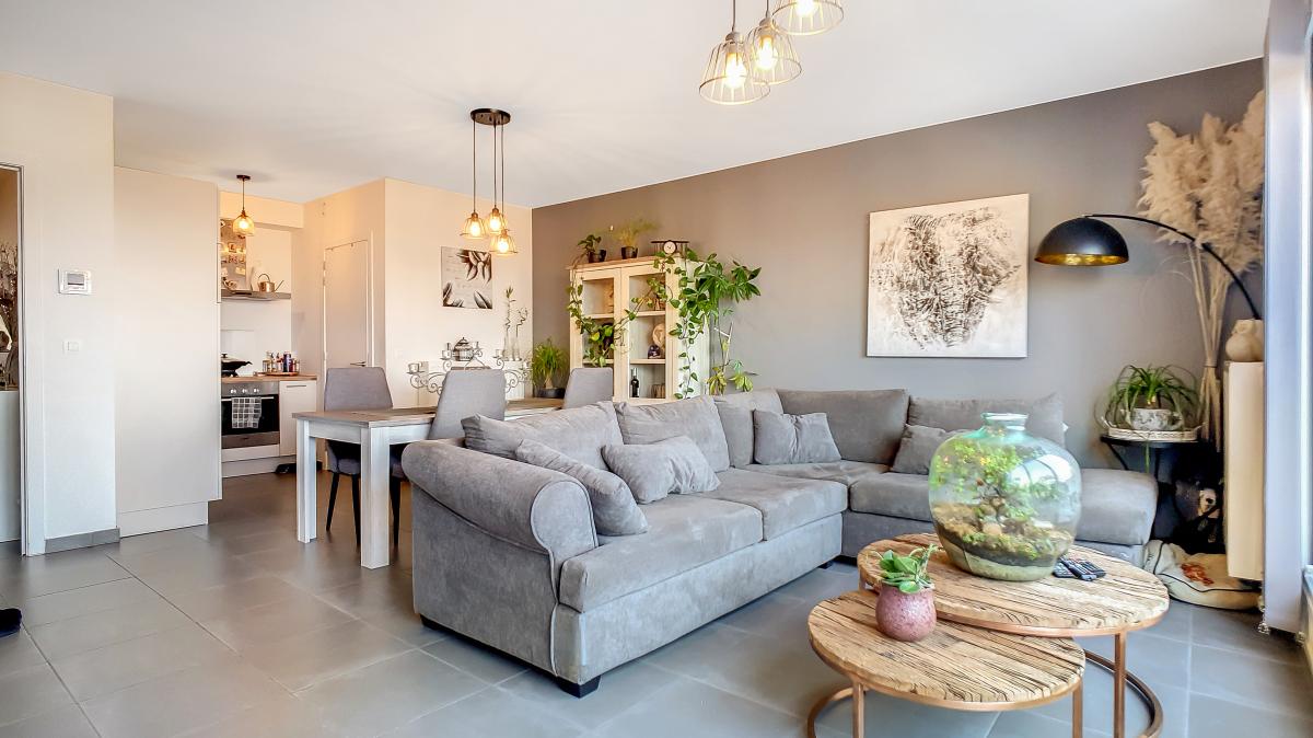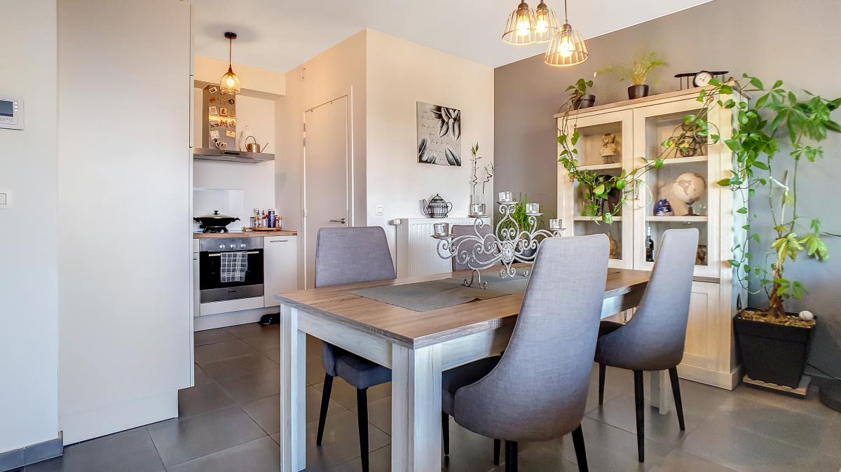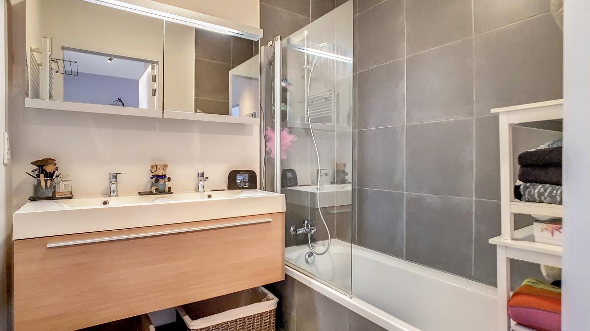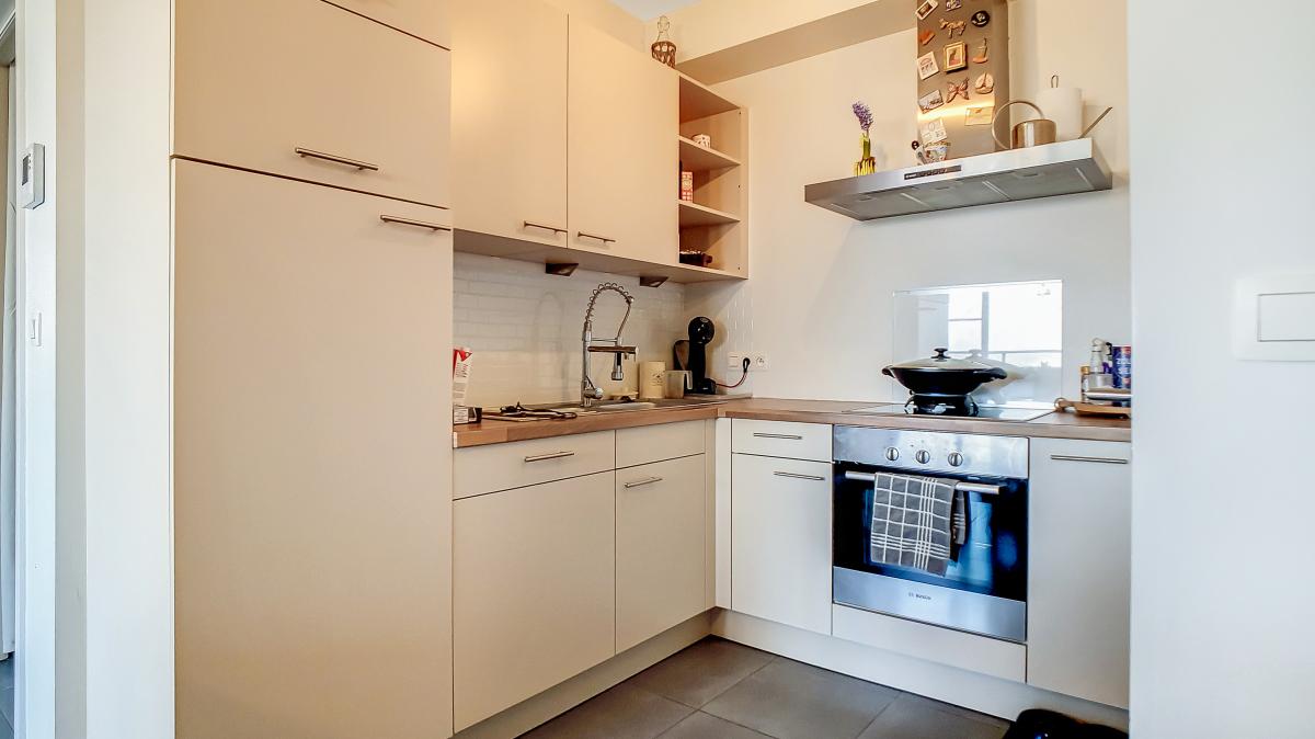 Revêtement du sol : carrelage Système de vidéoparlophonie Thermostat Équipements cuisine : four Bosh, hotte Bosh, taque Bosh, double évier, égouttoir, lave-vaisselle, frigo, emplacement micro-ondes Équipements salle de bains : radiateur porte-serviettes, double évier, bain-douche