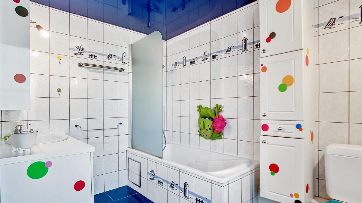 Équipements cuisine : taque induction, hotte, four à micro-ondes combiné, lave-vaisselle, évier, machine à café, plan de travail en granit Équipements salle de bains : baignoire (pouvant être utilisée également comme une douche), WC, meuble-évier avec miroir