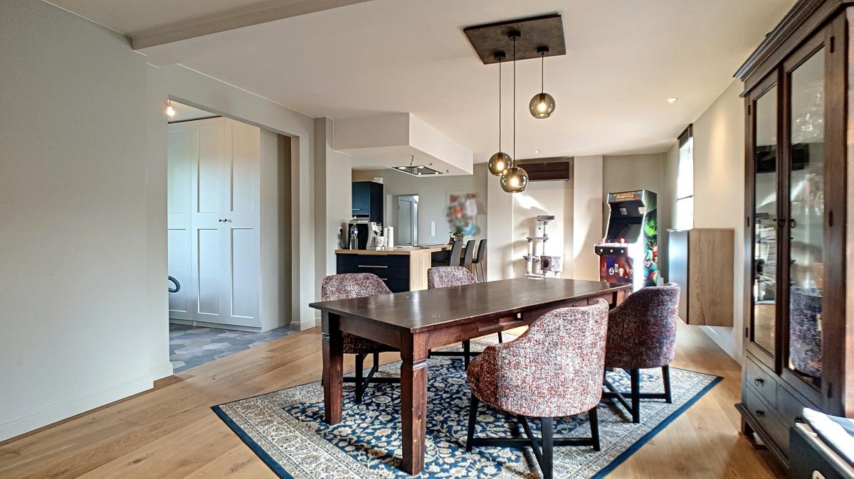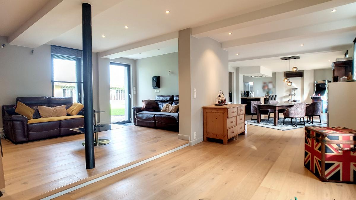 Salon de +/-36.2m² Salle à manger de +/-31.6m² Cuisine de +/-8.5m² Buanderie (dont WC) de +/-7.7m² Sas (avec escalier) de +/-5.7m²