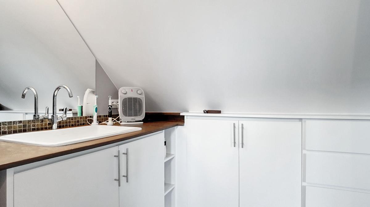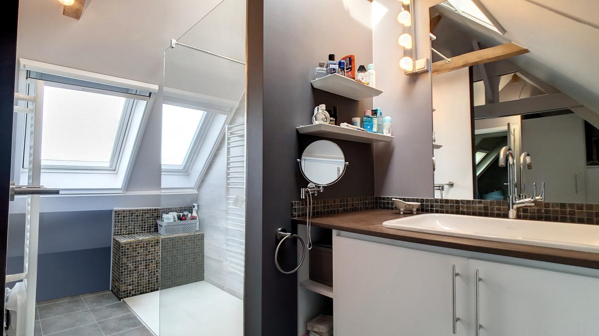 1 chambre avec nombreux placards encastrés et salle de douche (meuble évier, douche italienne) 1 chambre avec placards, douche, évier