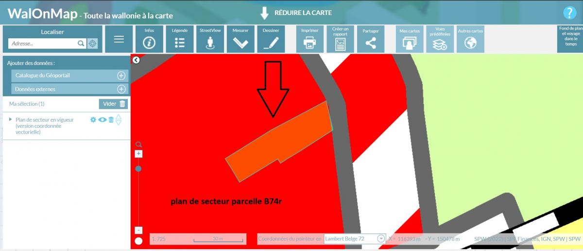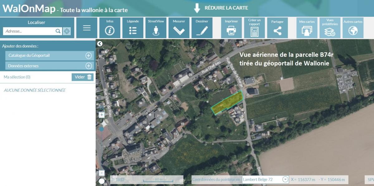 Parcelle B74r de 12a69ca : La maison bâtie sur le terrain portant le numéro 27. Plan de secteur : zone d’habitat Schéma de développement communal : zone d’habitat à caractère villageois-centre Guide communal d’urbanisme : aire de bâti villageois-centre Largeur parcelle : +/-18.79m Profondeur terrain : +/-65m