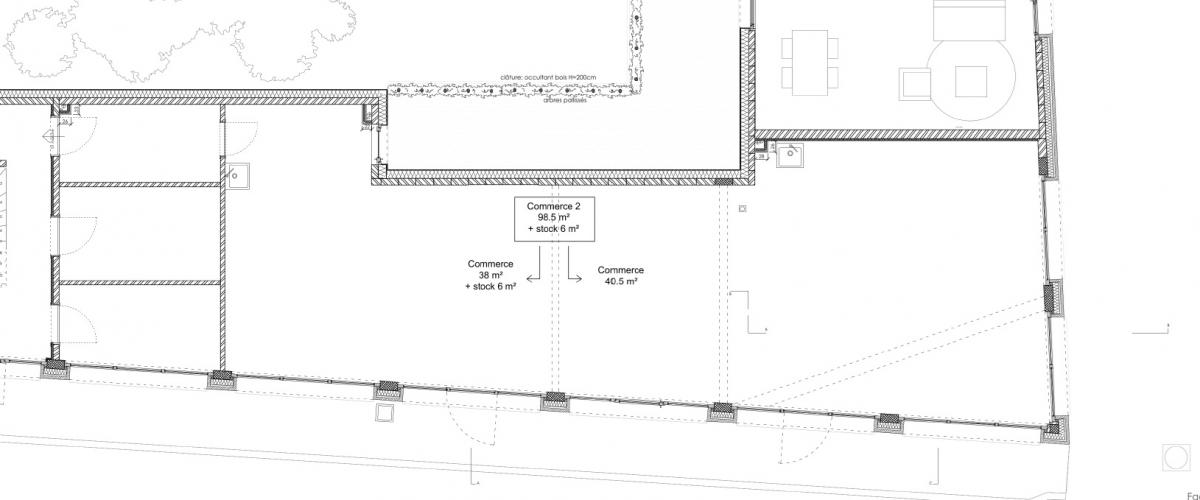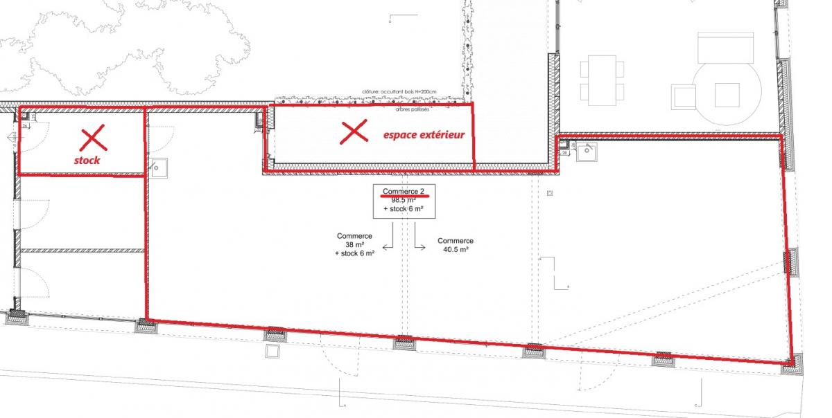 Pièce principale de +/-98.5m² Stock de +/-6m² Petit espace extérieur
