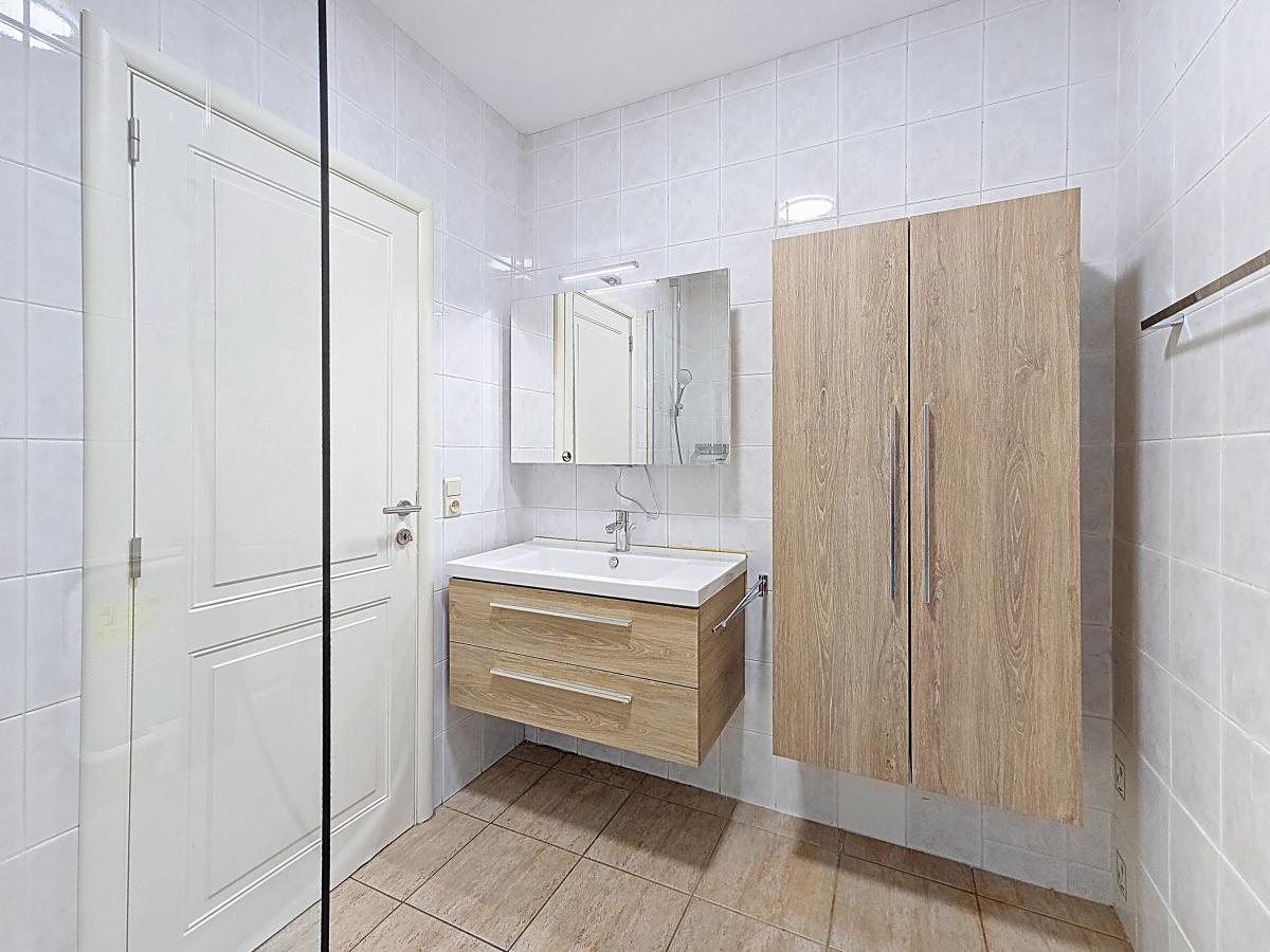 Équipements salle de douche : -douche italienne avec tub de douche, paroi en verre et siège pliable -meuble évier avec tiroirs, armoire-colonne fixée au mur, armoire murale avec miroir et luminaire intégré
