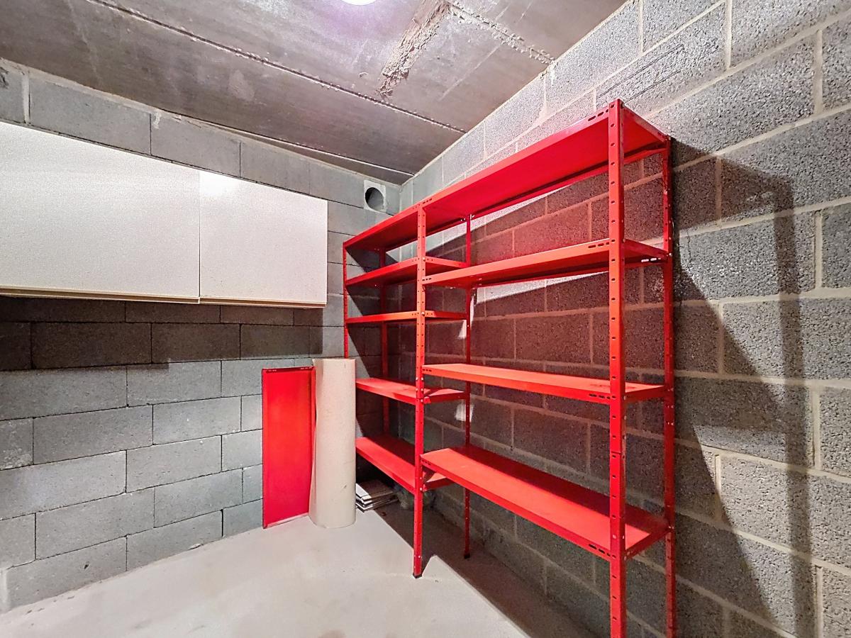 Cave privative au sous-sol de l’immeuble avec étagères et meubles de rangement