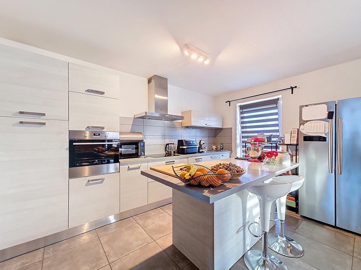 Équipements cuisine : taque Electrolux, hotte Electrolux, emplacement pour micro-ondes, lave-vaisselle Siemens, frigo Electrolux, évier, égouttoir, four Electrolux, ilot central avec armoires de rangement et plan de travail dont une partie adaptée aux chaises hautes/tabourets