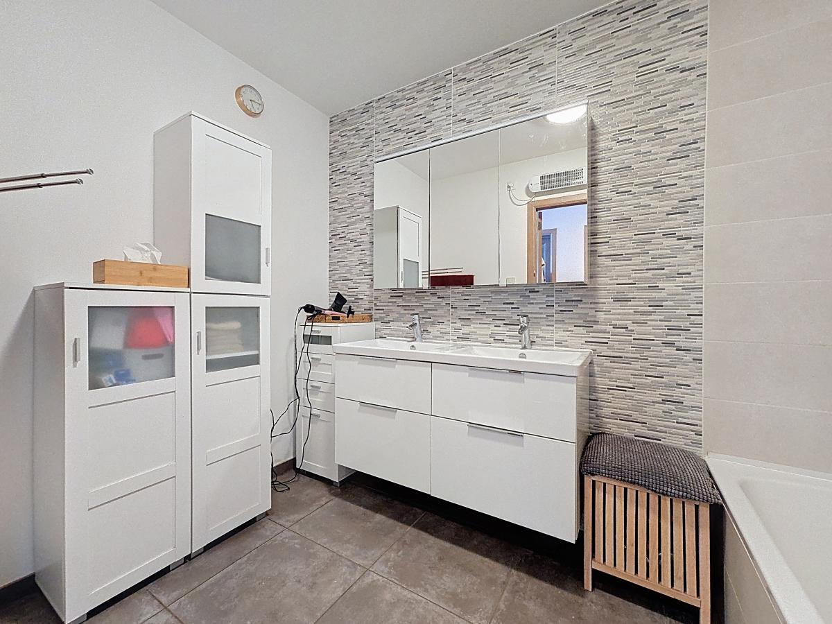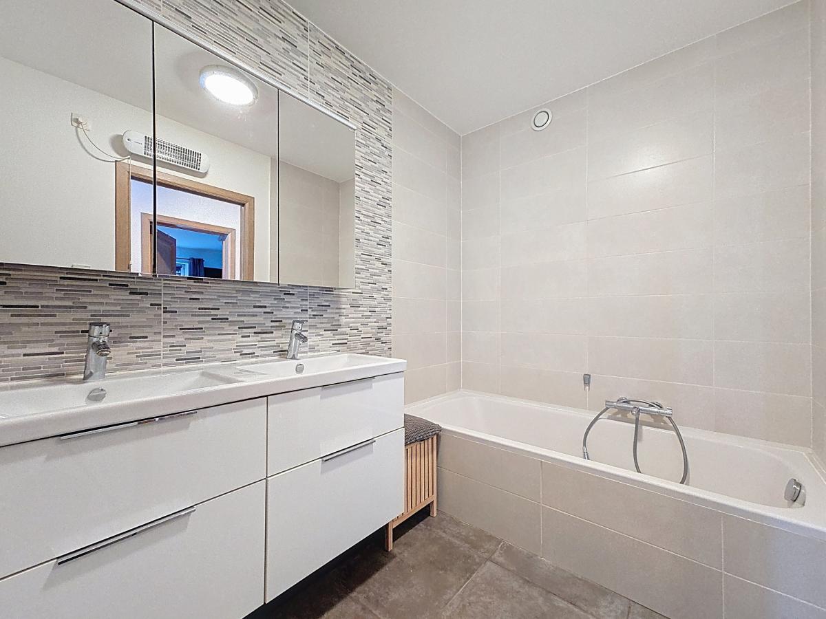 Situé à Marcq, aux portes de la Ville d’Enghien, ce très bel appartement plain-pied vous séduira par ses nombreux atouts. Situé au rez-de-chaussée d’une Résidence construite en 2016, il propose un hall d’entrée, un séjour de +/-35m² avec cuisine ouverte, une buanderie, un couloir principal, un WC séparé, une salle de bains, et 2 chambres à coucher de +/-13.8m² et 11m². Un spacieux jardin privatif, accessible via le séjour et orienté sud/sud-ouest, vous permettra de profiter des beaux jours. Au sous-sol de la Résidence (accessible via un ascenseur), un grand garage privatif avec porte motorisée offre, grâce à sa surface de +/-23m², un stationnement sécurisé et un espace de stockage non négligeable. Bonne performance énergétique (PEB en B), chauffage par le sol, double vitrage, système de ventilation,… bref, un nid douillet tout confort ! Le bien jouit de la proximité des commodités : gare d’Enghien à +/-2.7km (train direct vers Bruxelles en +/-20min), autoroute E429 à +/-1km (Bruxelles, Tournai, Lille), arrêt de bus à quelques mètres, nombreuses écoles et commerces à quelques minutes à pied. Loyer : 1000€/mois (pour l’appartement et le garage privatif) + provision de 180€/mois comprenant les charges communes (nettoyage des communs, entretien et réparation courantes, entretien jardin et abords, frais d’ascenseur, électricité des communs, eau des communs, frais garages), le chauffage de l’appartement, et le chauffage de l’eau de l’appartement.