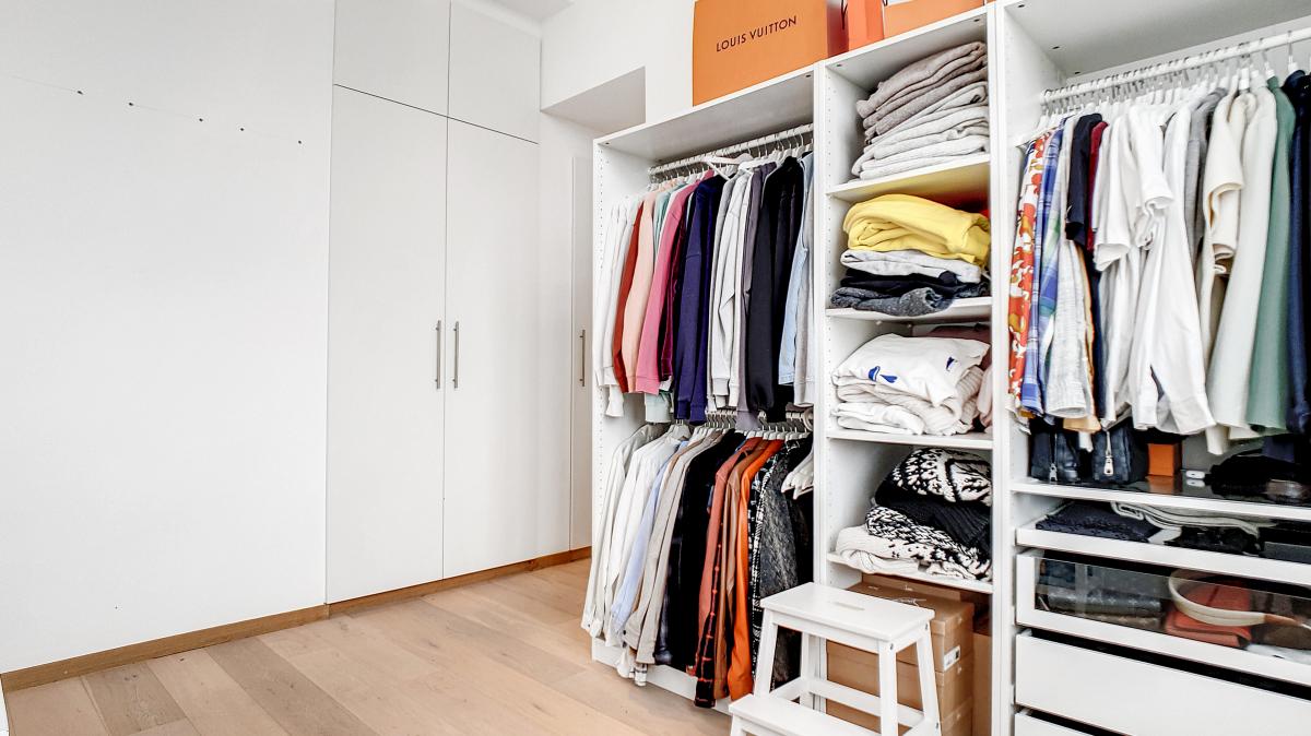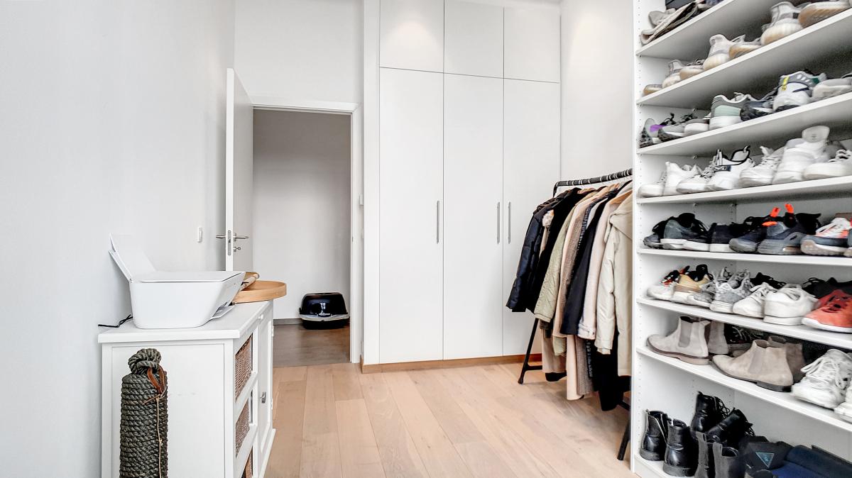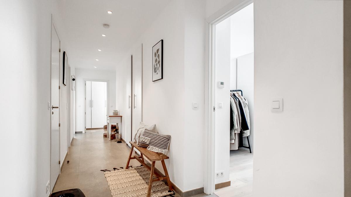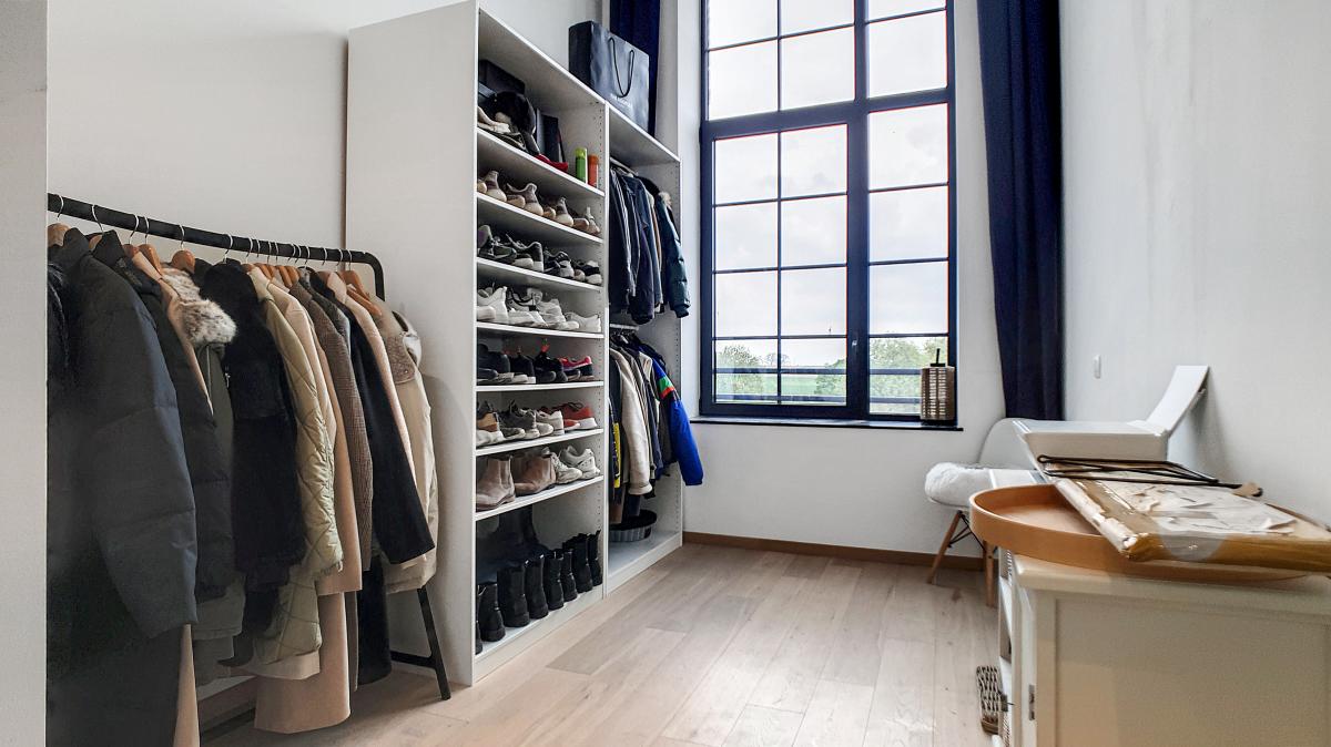Plusieurs placards encastrés Rails déjà installés aux fenêtres 2 WC (1 toilette séparée avec WC suspendu et lave-mains, et 1 WC suspendu dans la salle de bains)