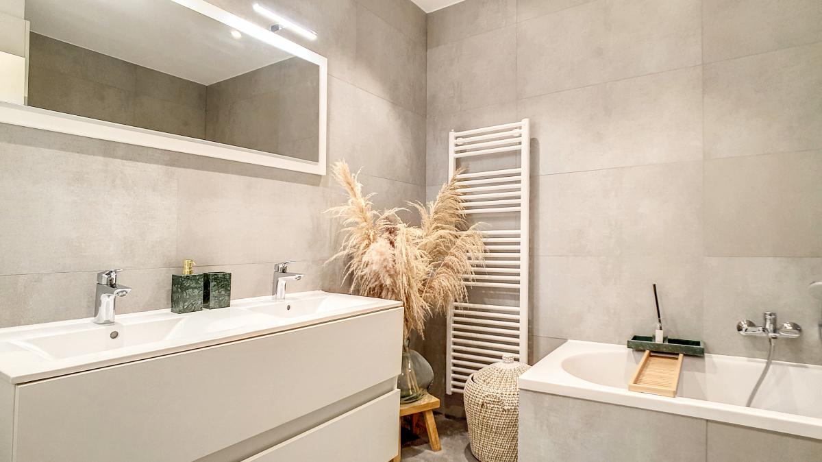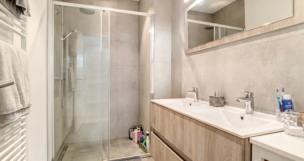 Équipements cuisine : 2 éviers, frigo Siemens, petit congélateur, four Siemens, micro-ondes Siemens, taque vitrocéramique Siemens, hotte Novy, lave-vaisselle Siemens Équipements salle de bains isolée : bain, meuble double évier, miroir avec luminaires, radiateur porte-serviettes, WC suspendu, armoire avec raccord pour machine à laver Équipements salle de douche 1 : douche, meuble évier, miroir, luminaire Équipements salle de douche 2 : douche, meuble double évier, miroir avec luminaires, radiateur porte-serviettes