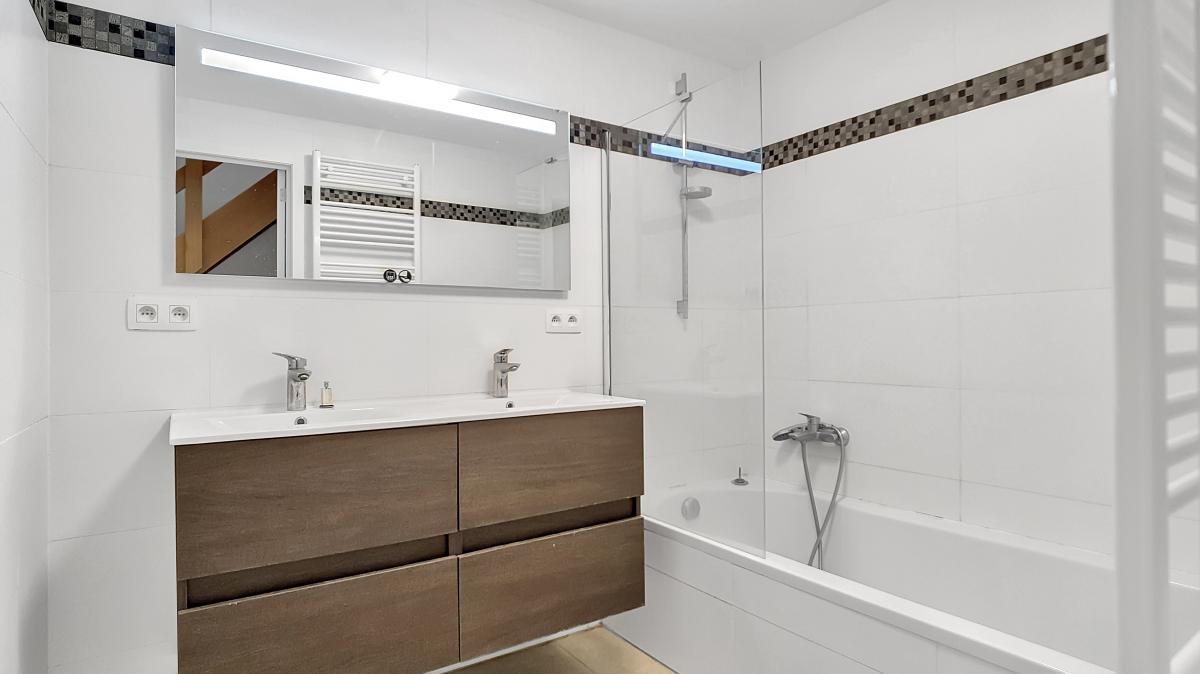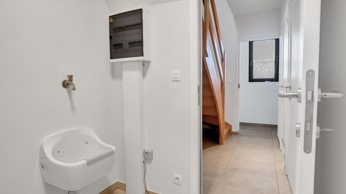 Équipements salle de bains : meuble double-évier, miroir, baignoire (avec paroi en verre permettant l’utilisation en douche), radiateur porte-serviettes Buanderie avec évier de service, tableau des fusibles, raccordement pour une machine à laver WC avec lave-mains
