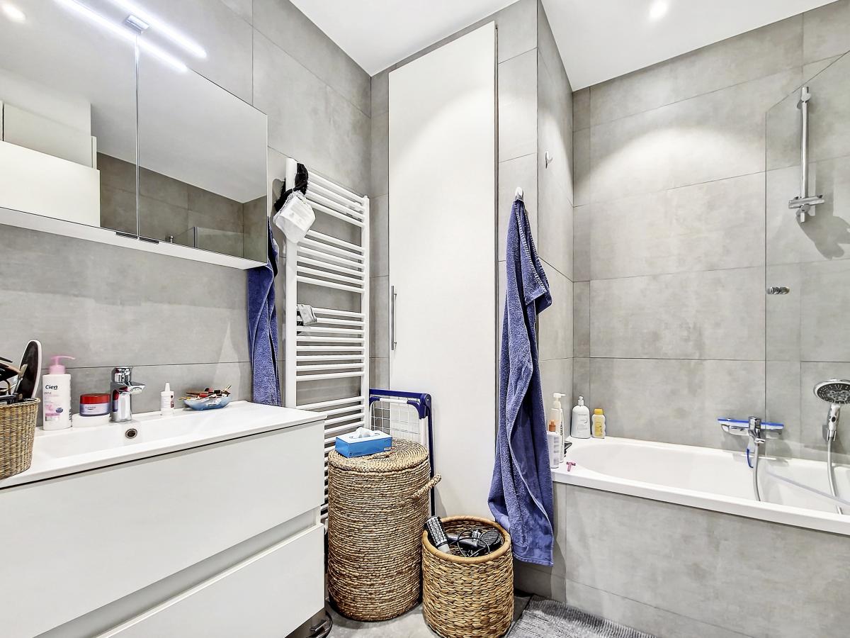 Équipements cuisine (cuisine avec ilot central) : 2 éviers, frigo Siemens, petit congélateur, four Siemens, micro-ondes Siemens, taque vitrocéramique Siemens, hotte Novy, lave-vaisselle Siemens Équipements salle de bains : meuble-évier, armoire-miroir avec luminaire, radiateur porte-serviettes, baignoire (pouvant être utilisée en douche avec paroi en verre), WC suspendu, placard prévu pour la machine à laver