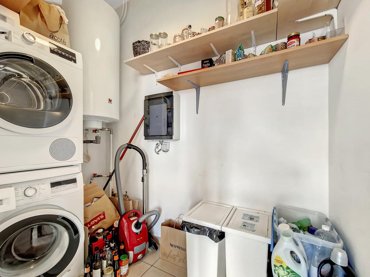 Buanderie avec boiler électrique, étagères, emplacements pour machine à laver et sèche-linge