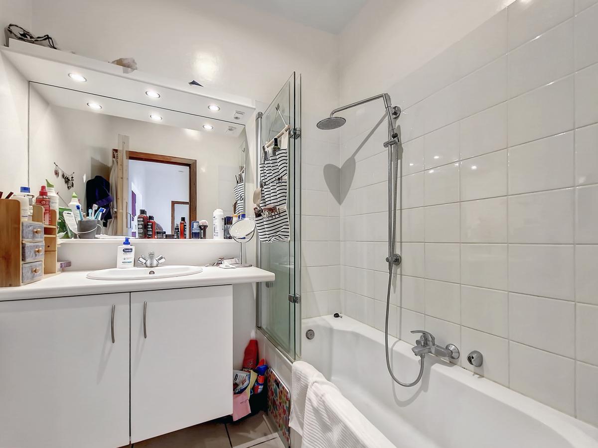 Équipements salle de bains : meuble-évier avec miroir et luminaires, baignoire avec paroi (pouvant être utilisée en douche)