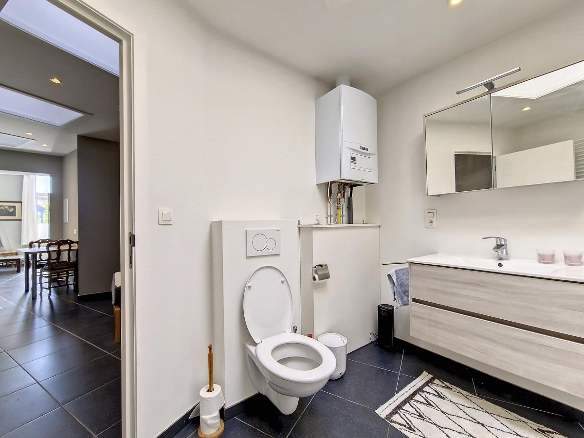 Équipements cuisine : table fixée au mur, évier, égouttoir, taque vitrocéramique, hotte, frigo, four, lave-vaisselle Équipements salle de douche : WC suspendu, douche italienne, meuble-évier, radiateur porte-serviettes