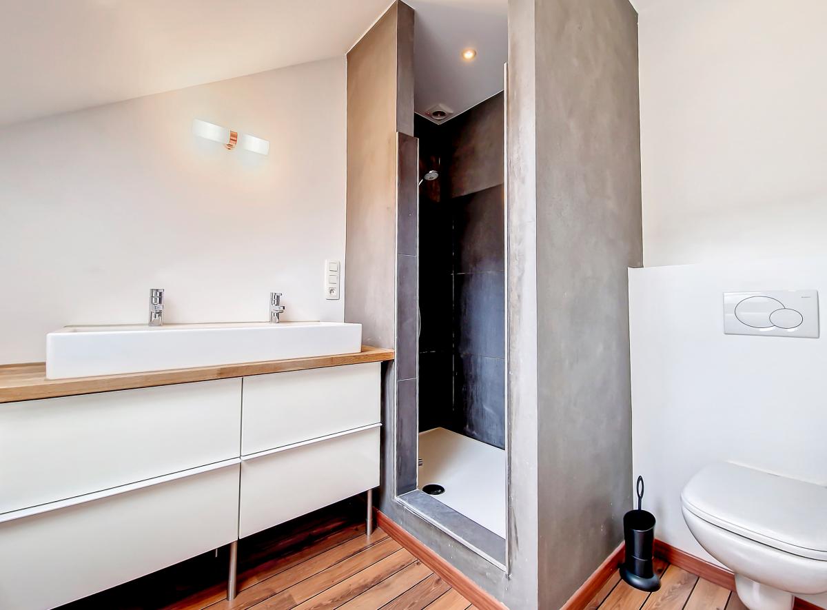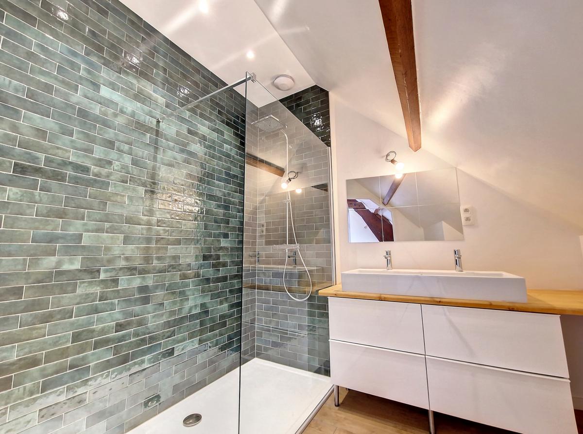 Équipements salle de douche (1er étage arrière) : douche italienne, meuble double évier, miroir, WC Équipements salle de bains (1er étage avant) : bain, meuble double-évier, douche, WC