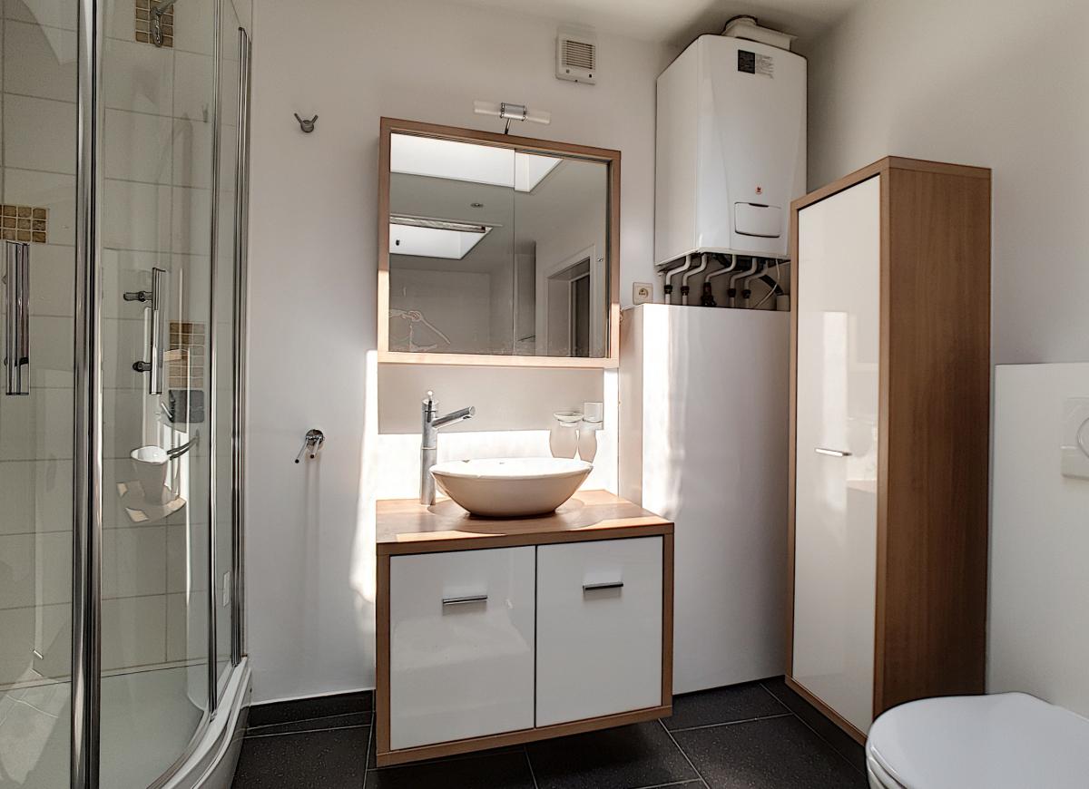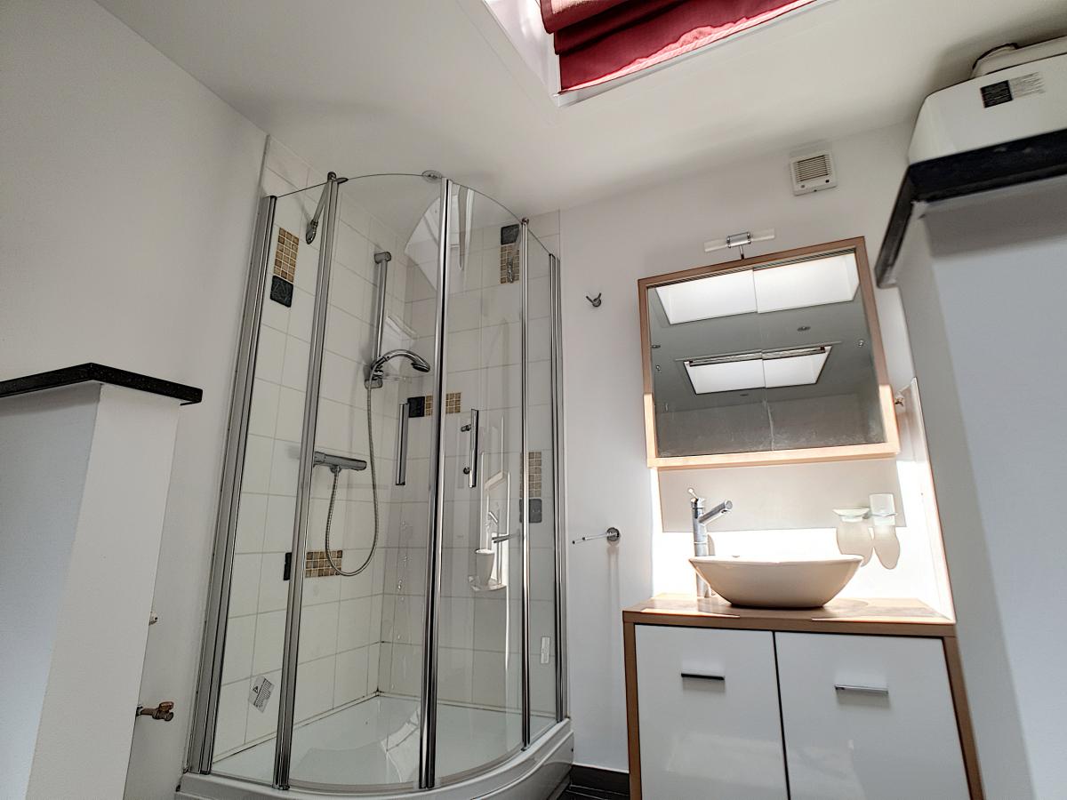 Cuisine équipée : évier, égouttoir, taque vitrocéramique, hotte, frigo, four, lave-vaisselle Salle d’eau : douche, meuble-vasque, wc