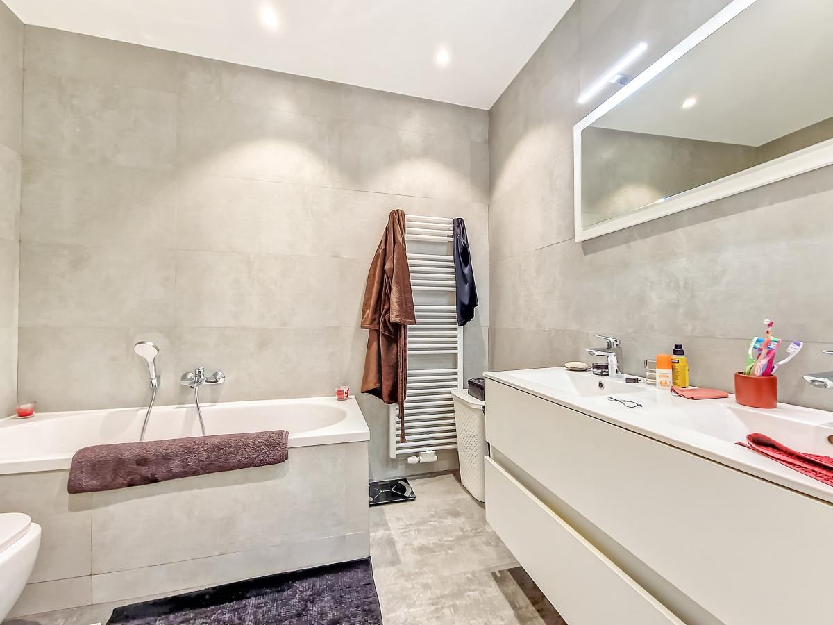 Équipements cuisine : 2 éviers, frigo Siemens, petit congélateur, four Siemens, micro-ondes Siemens, taque vitrocéramique Siemens, hotte Novy, lave-vaisselle Siemens Équipements salle de bains : bain, meuble double évier, miroir avec luminaires, radiateur porte-serviettes, WC suspendu, armoire avec raccord pour machine à laver Équipements salle de douche : douche, meuble-évier, meuble-miroir et luminaire